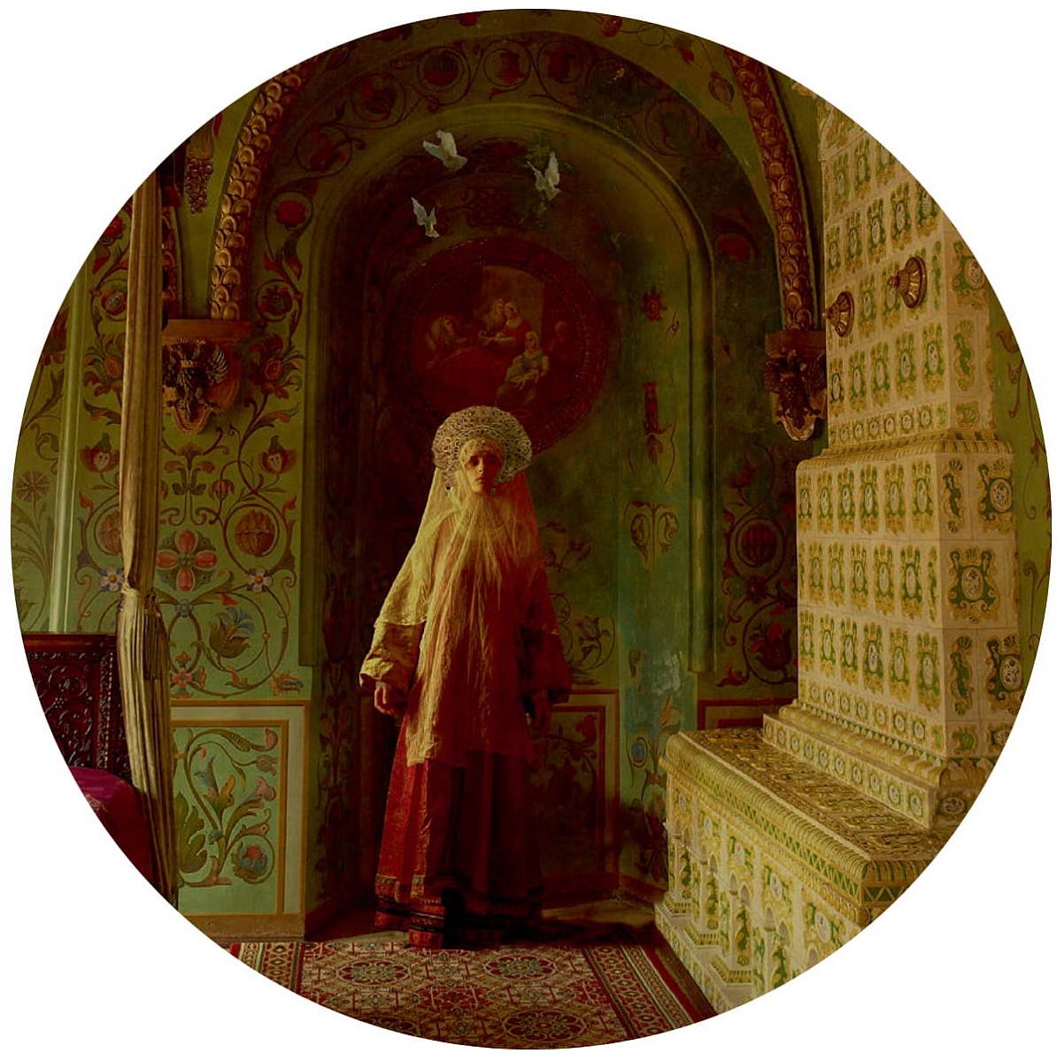 Клавихо-Телепнев В. Из серии "Кремль" Проект «Кремль» посвящен новому взгляду на пространство Московского Кремля. Автора проекта вдохновила романтическая история любви царицы Елены Глинской (XVI в.) и конюшего, боярина, воеводы Ивана Федоровича Овчины Телепнева-Оболенского, продлившейся всего четыре года и во многом изменившей историю страны. Материал: Печать на дереве Размер: в раме диаметр 80 см