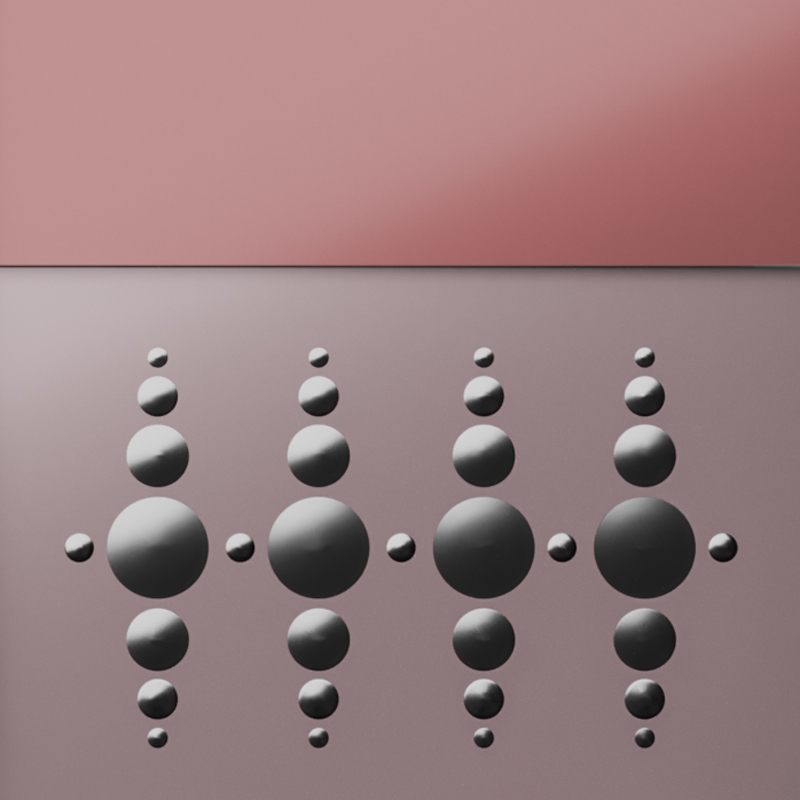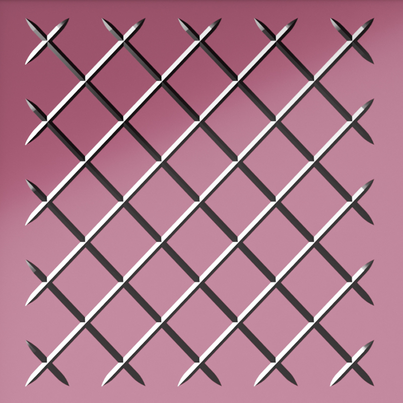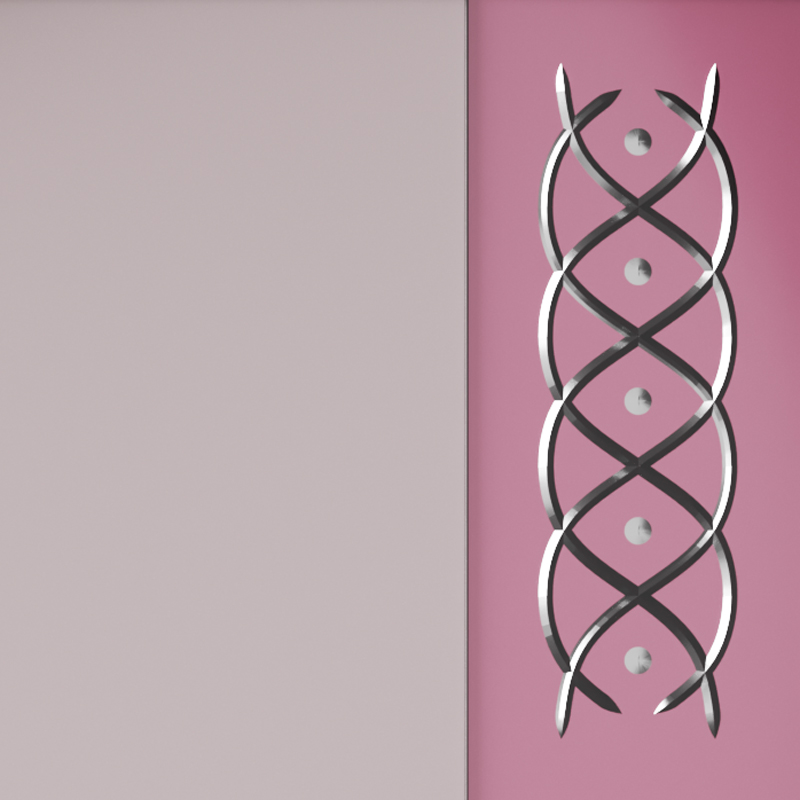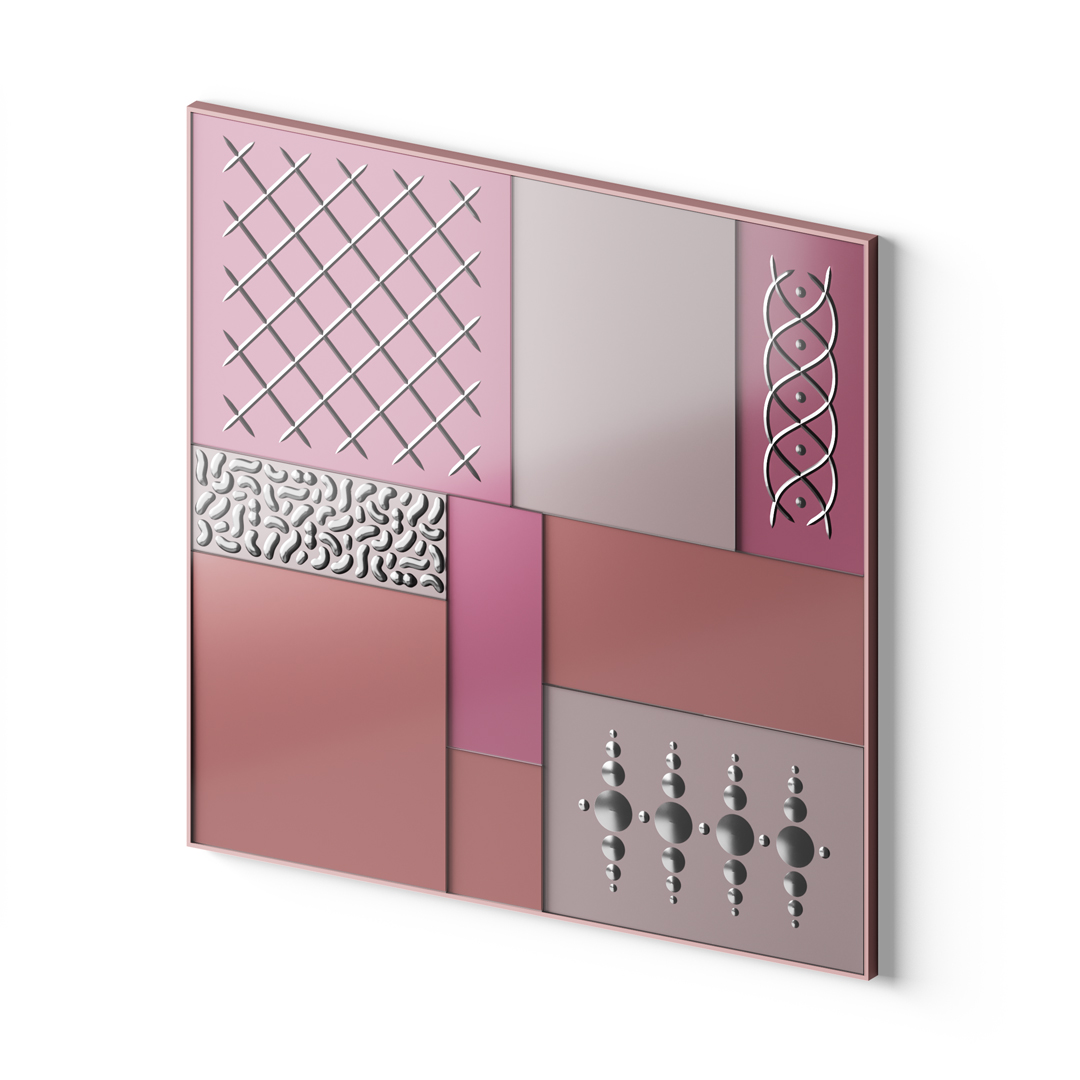 Рама из дерева, крашенная глянцевым лаком оттенка «antique rose». Сверху - разноразмерные панели из сверх-прозрачного стекла толщиной 6 мм, крашенные в разные оттенки розового. По поверхности нанесена серебряная гравировка, выполненная вручную, что делает каждый экземпляр уникальным.