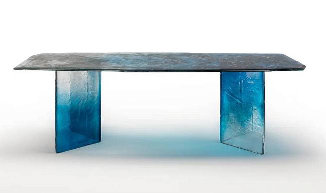 Столешница и ножки выполнены по уникальной технологии из двух слоев стекла, запеченных вместе.Все изделие покрыто лаком градации от синего до прозрачного, с частичным серебрением оборотной стороны.