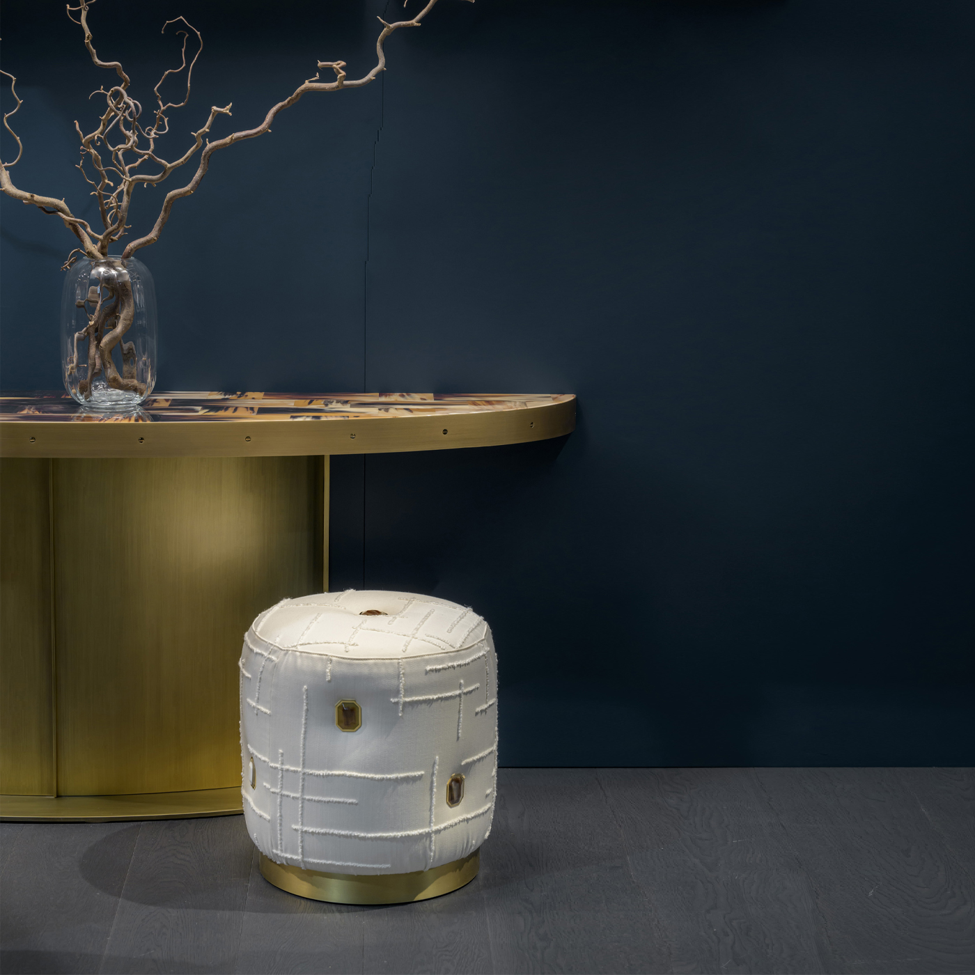 Пуф с обивкой из бархата (ткань «Магнолия») с инкрустацией из рога.