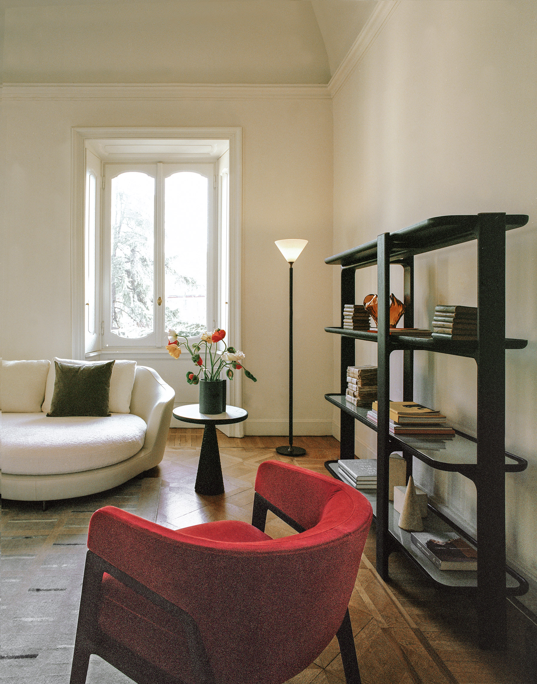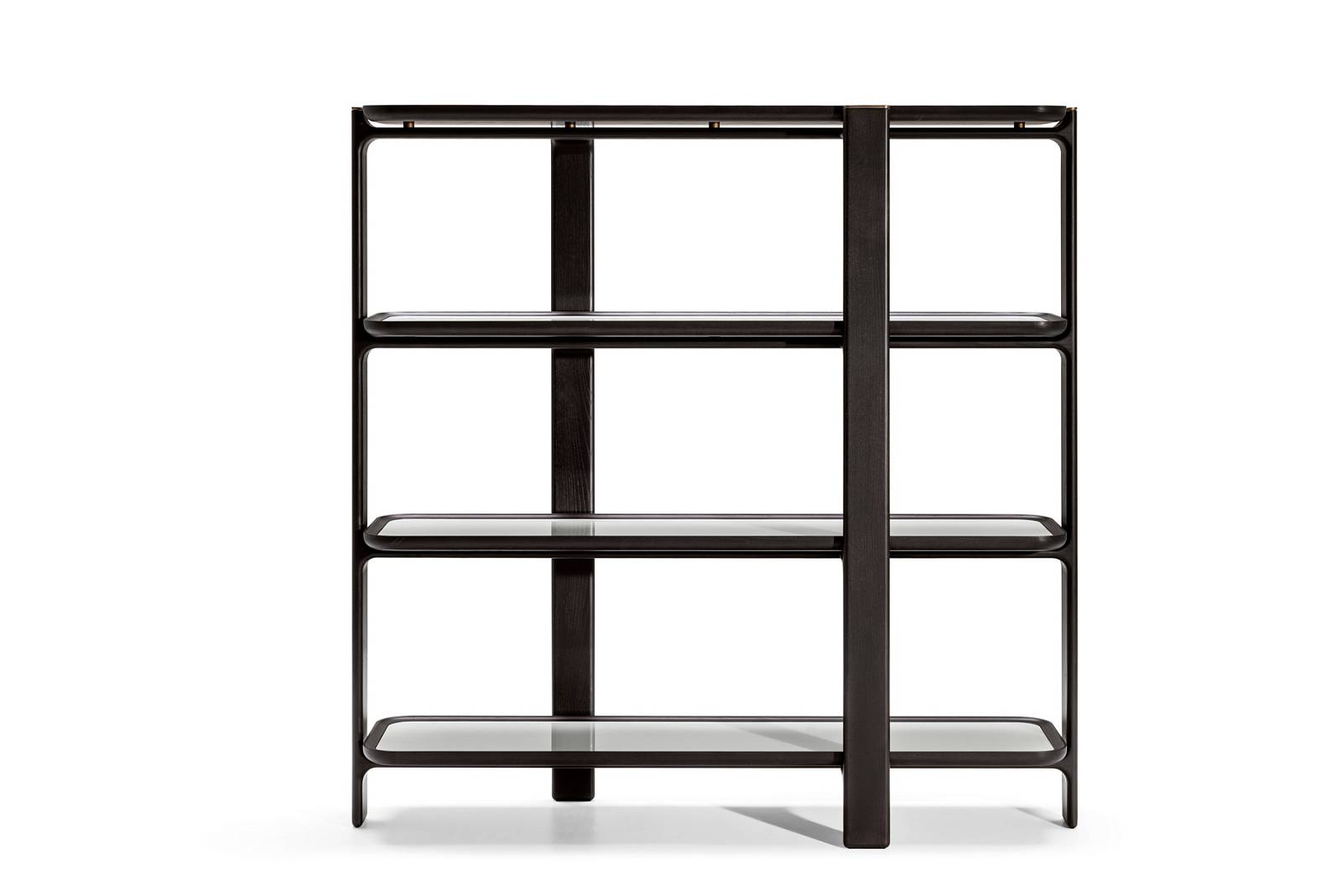 Книжный шкаф DUO состоит из стоек и расположенных в шахматном порядке полок с конструкцией из ясеня, доступной в различных вариантах отделки. Нижняя часть полок выполнена из фанеры из тополя, шпонированной ясенем, с той же отделкой, что и конструкция. По желанию внутрь полочных конструкций можно вставить мраморную или окрашенную с обратной стороны стеклянную столешницу для еще более элегантного эффекта. Книжный шкаф DUO доступен с четырьмя или двумя полками. Металлические детали с отделкой под бронзу придают общему дизайну дополнительный штрих класса и изысканности.