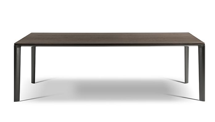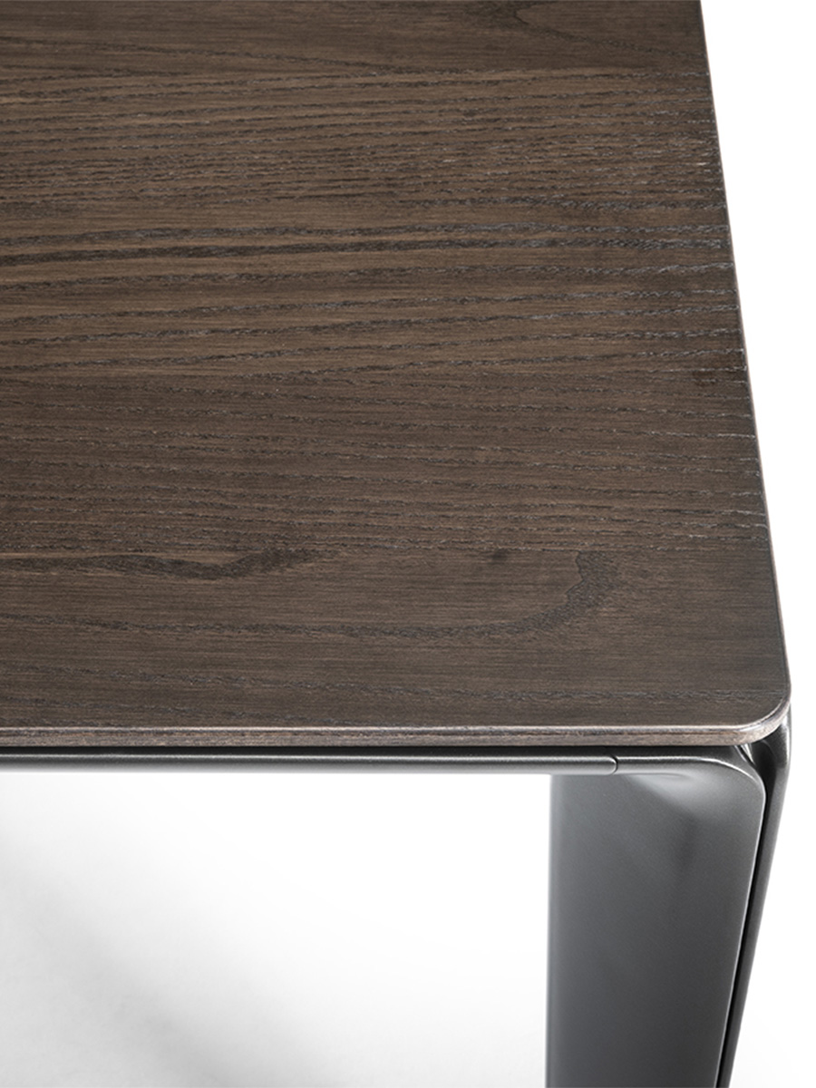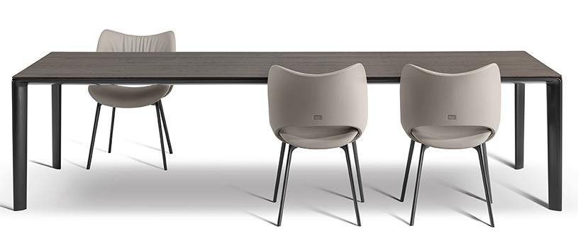 Главная деталь — ножки из литого алюминия. Две створки каждой ножки изгибаются и соединяются, не соприкасаясь, создавая изящный эффект светотени в центре. Это утончённое стилистическое решение - отсылка к мастерству работы с кожей, чем славится Poltrona Frau. напоминает мастерство работы с кожей — материалом.