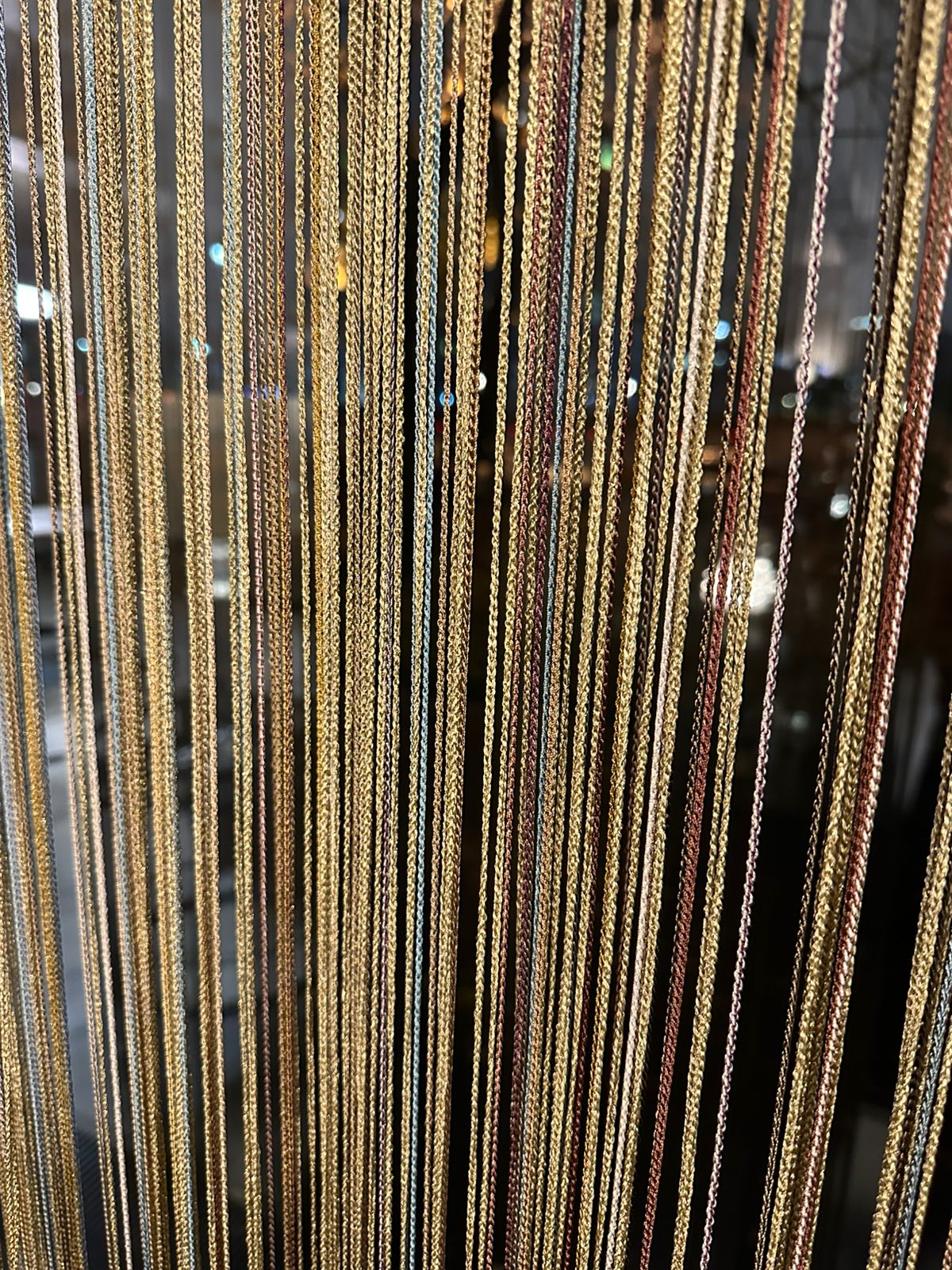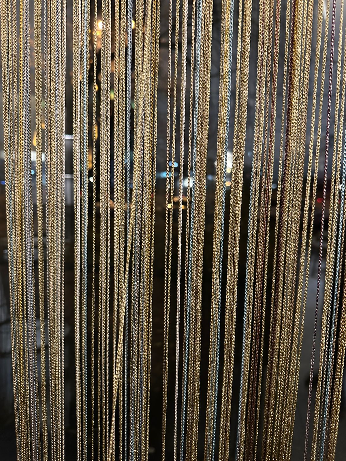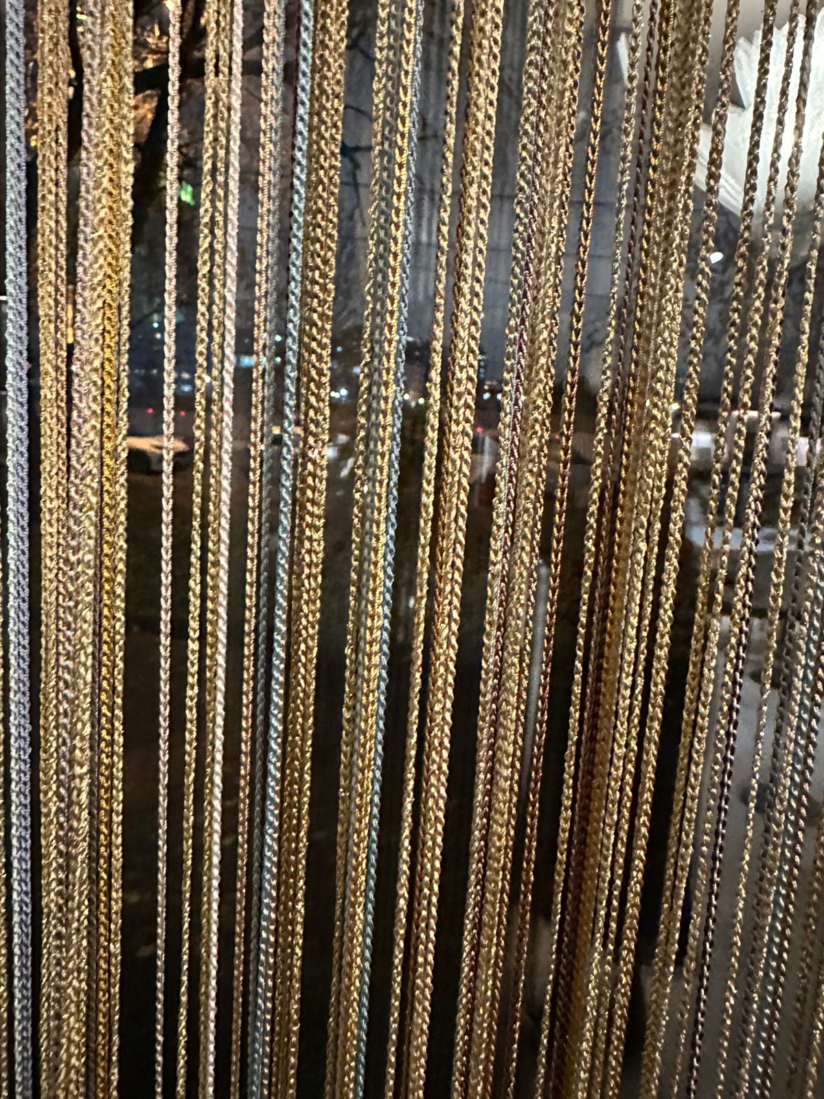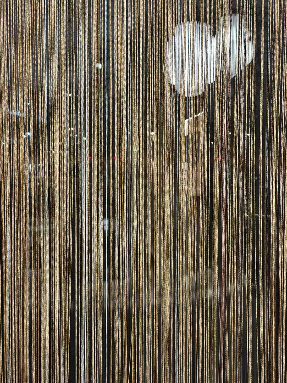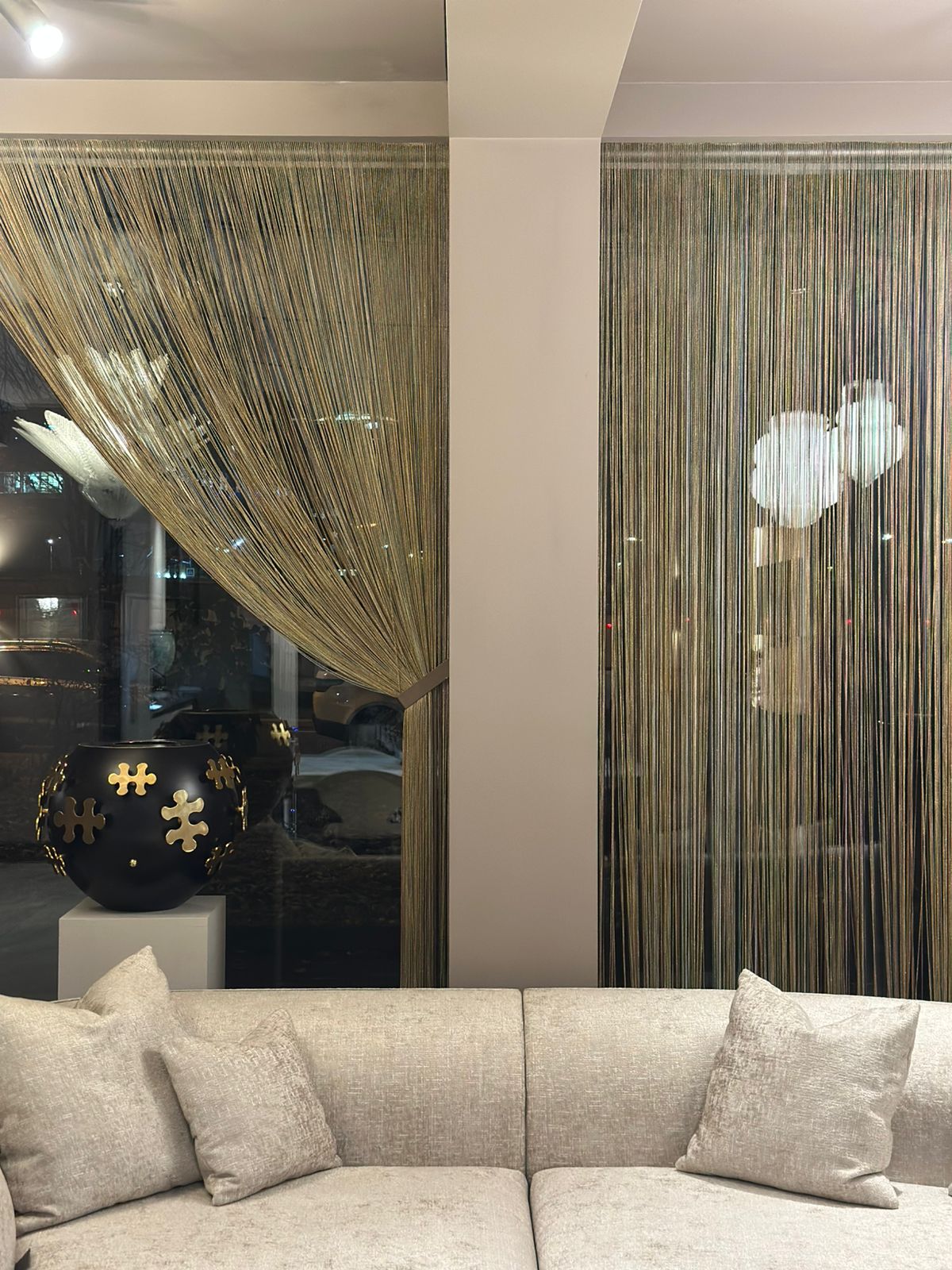 Невесомые нити в теплых оттенках бежевого, коричневого, золотого и контрастного голубого цветов прекрасно подойдут для зонирования или выступят в роли традиционных штор на окна. Их конструкция рассеивает солнечный свет, обеспечивая свободную циркуляцию воздуха и сохраняя воздушность и легкость форм.