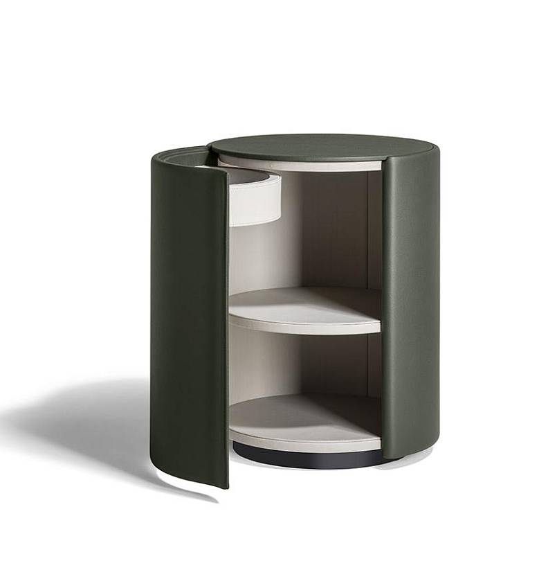 Опорный каркас и дверца прикроватной тумбы Stock’n Roll выполнены из изогнутой фанеры бука и массива бука. Обивка изготовлена из кожи Pelle Frau® с однотонной декоративной строчкой.