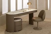 Кожа, металлические детали. Полка из мрамора. Фасад выдвижных ящиков отделан кожей с прострочкой.