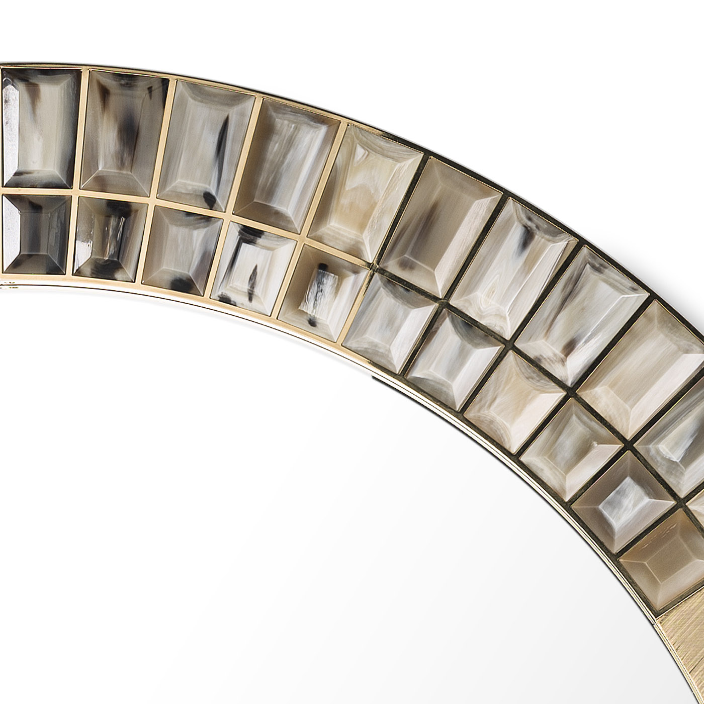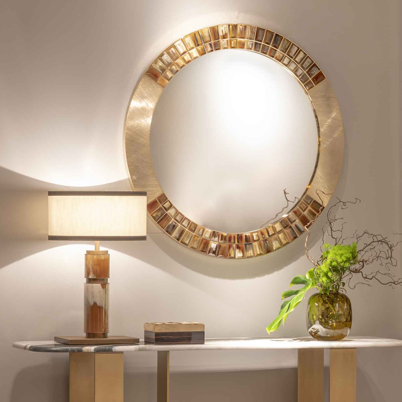 Древние техники, унаследованные от флорентийского ювелирного искусства, воплотились в зеркале Astrid — роскошном элементе декора. Полированные вставки из рога, вручную огранённые в форме драгоценных камней, изящно вплетены в латунную раму с гравировкой, покрытую 24-каратным золотом. Великолепное сочетание материалов и мастерства, придающее интерьеру утончённый и выразительный характер.
