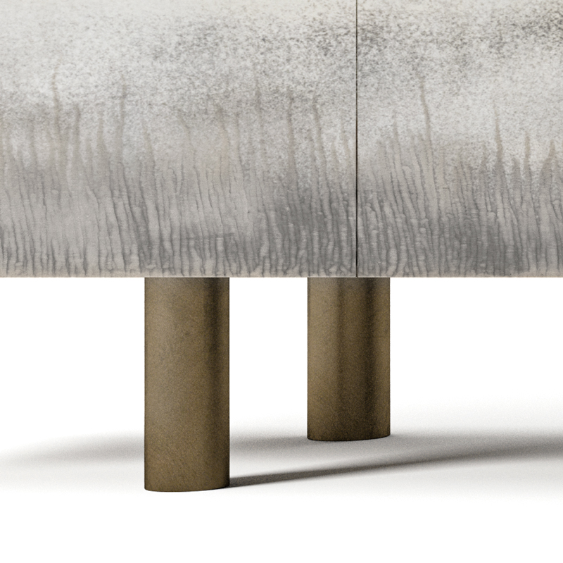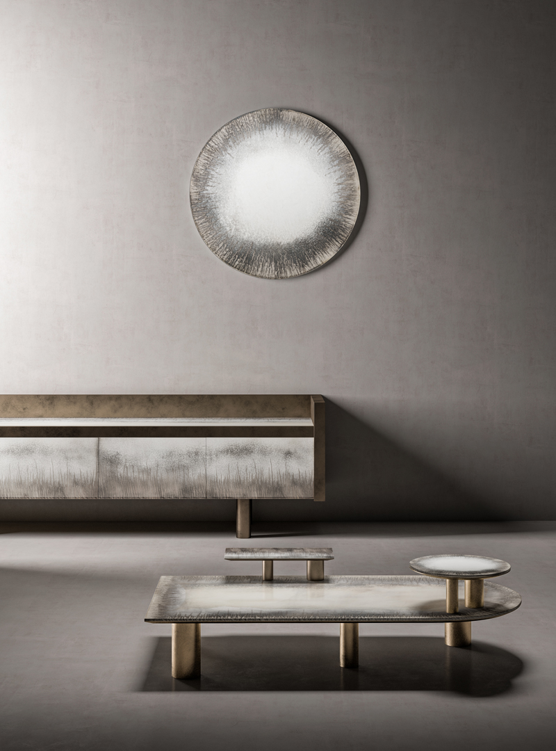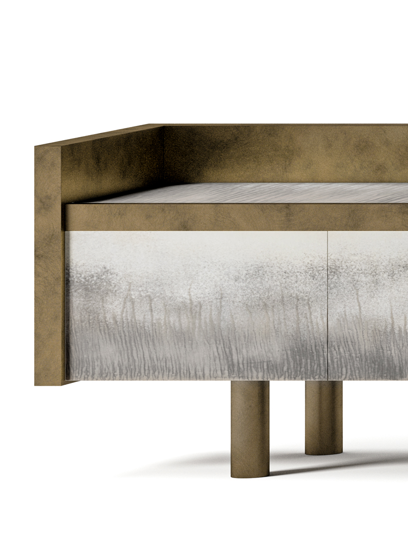 Комод с четырьмя выдвижными ящиками с механизмом push-pull. Каркас из шпонированного многослойного дерева скрыт под благородным покрытием «состаренная латунь». Фасады — матированное стекло толщиной 6 мм с идеально полированными гранями и изящной гравировкой алмазным кругом. С обратной стороны нанесено серебрение с плавным переходом от выраженного эффекта старины к легкому старению.