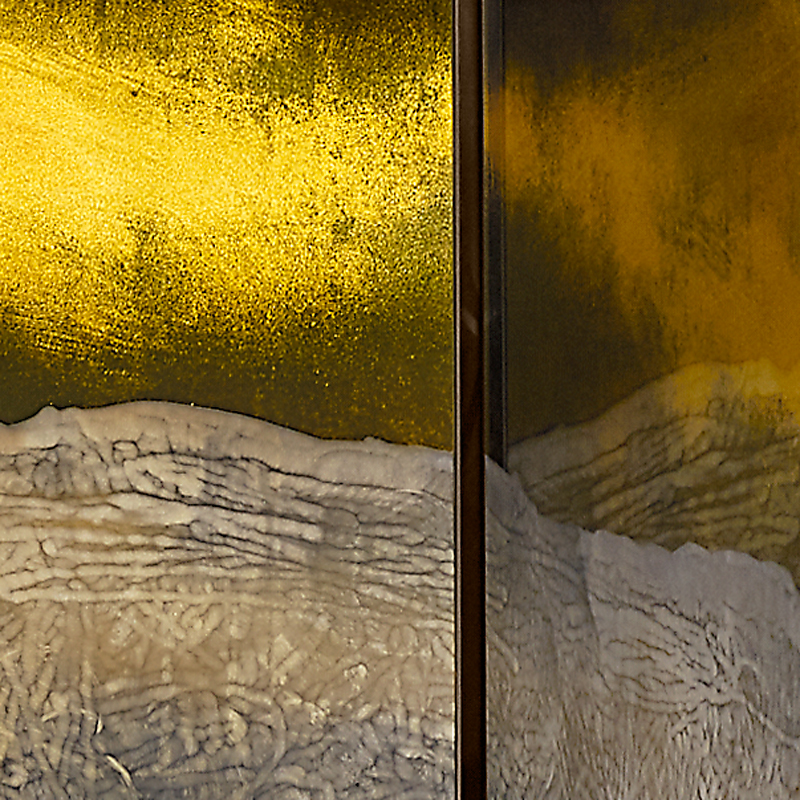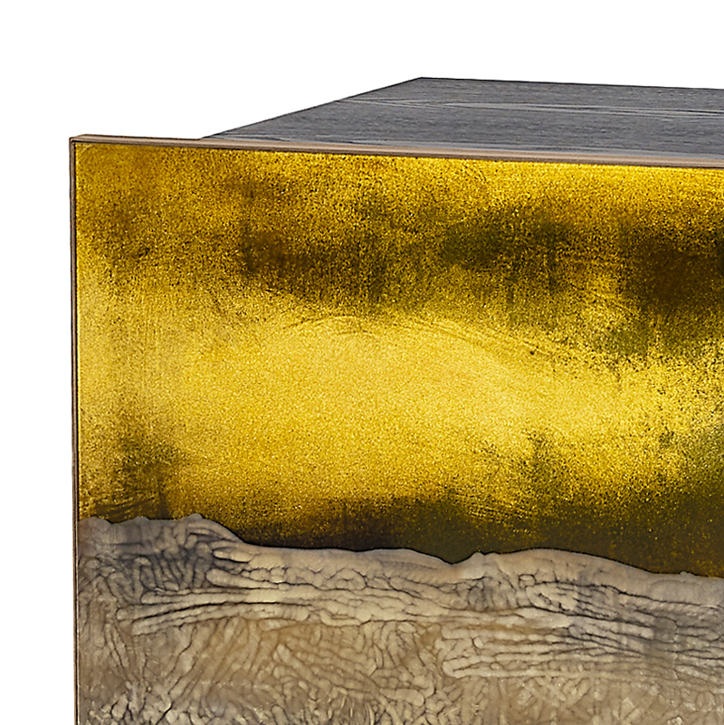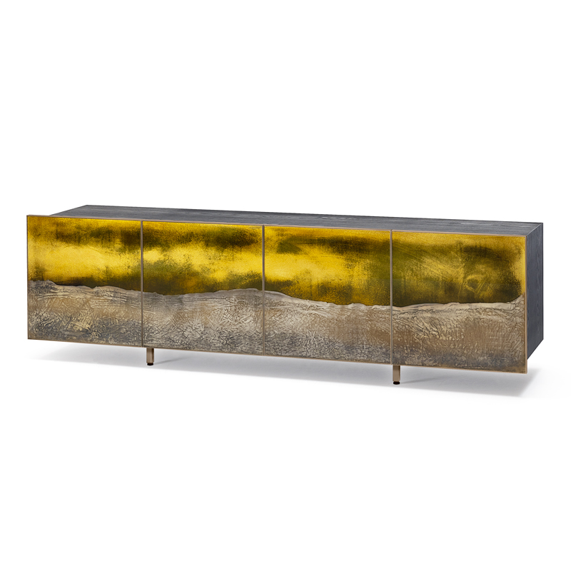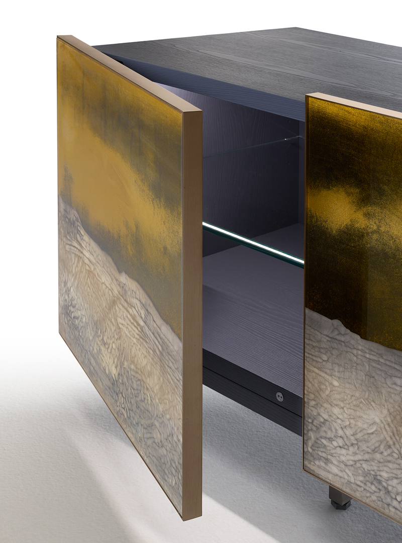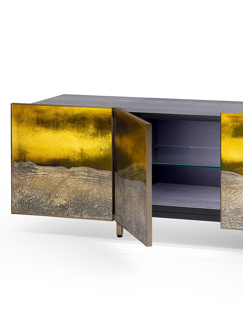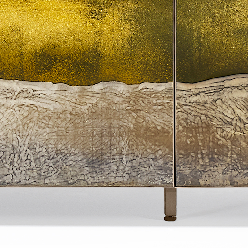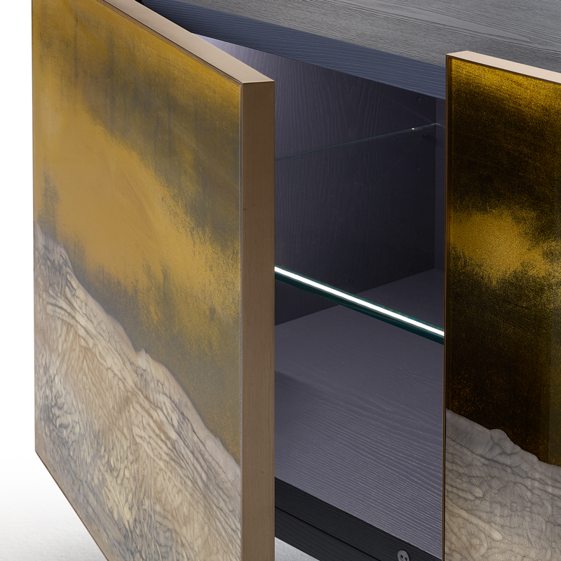 Структура из многослойного дерева с отделкой лакированный шпон ясеня. Четыре двери из прозрачного стекла с гравировкой, золотым декором и серебрением под старину. Внутри регулируемые полки из сверх-прозрачного стекла. Профили дверей и металлические ножки отделаны под состаренную латунь.