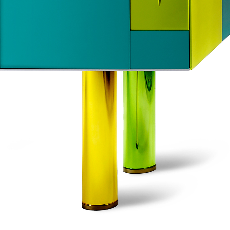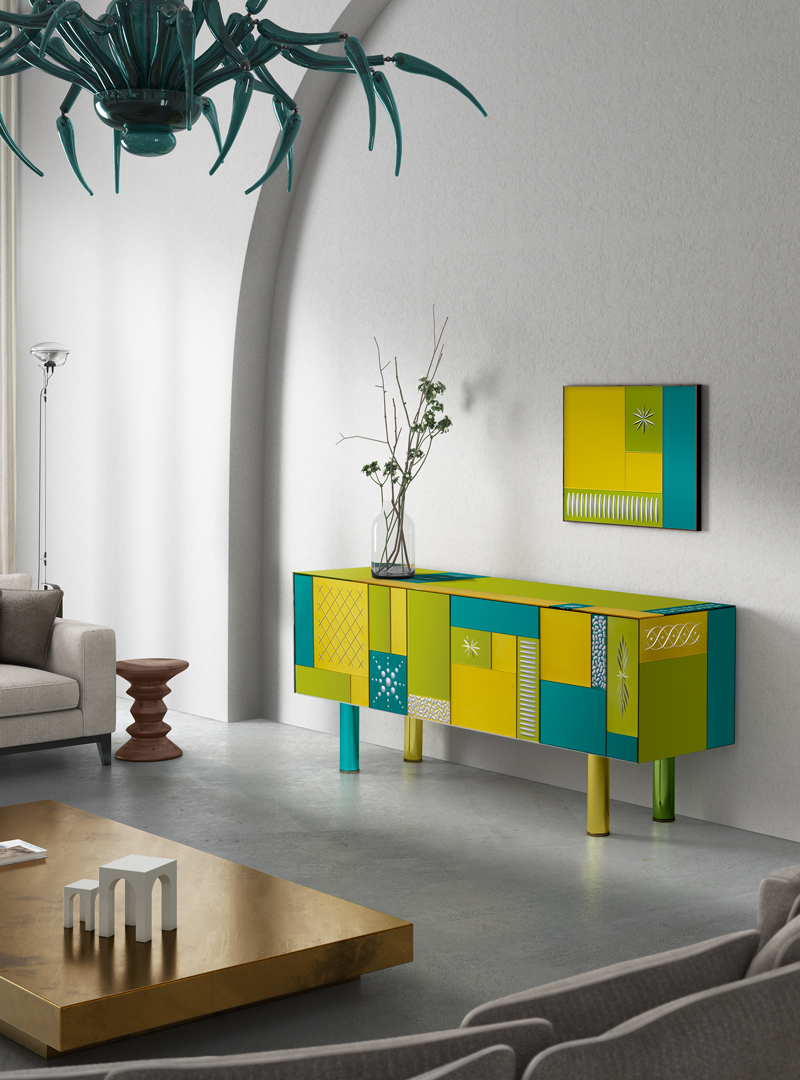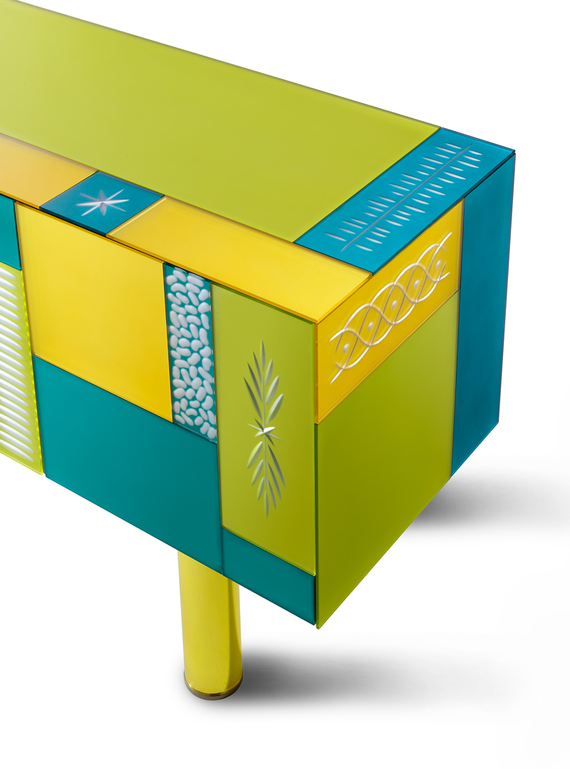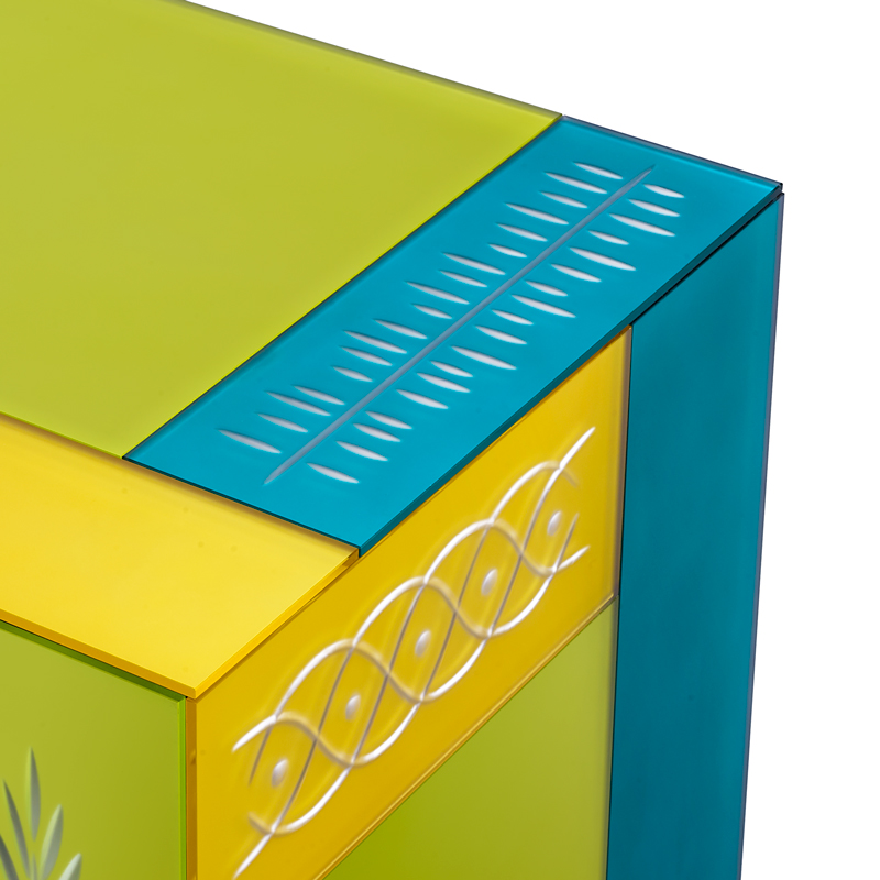 Четыре фасада и четыре ящика с системой push-pull (без ручек). Структура из многослойного дерева. Панели из матированного стекла 6 мм, покрашенные в разные цвета и украшенные ручной гравировкой. Ножки: цветное боросиликатное стекло с серебрением. Возможны незначительные отличия цвета из-за нанесения лака вручную.