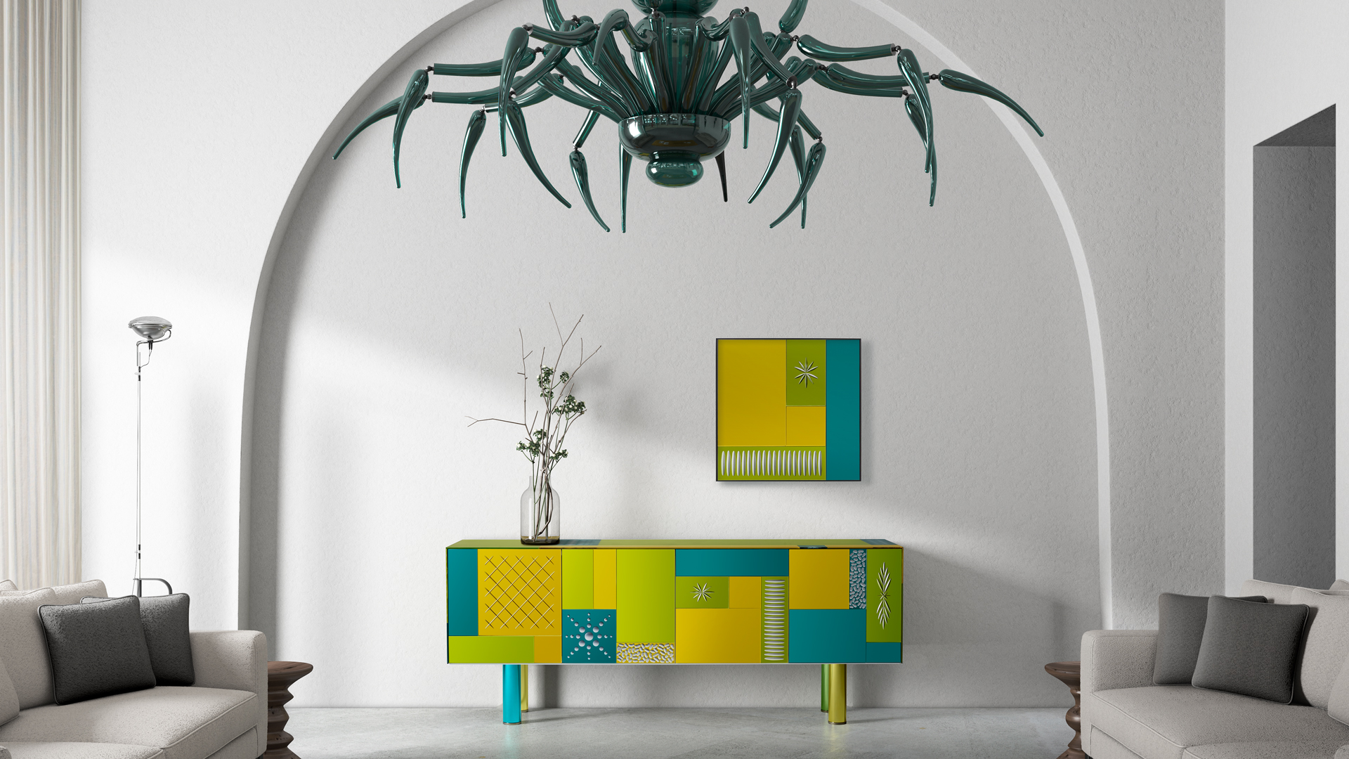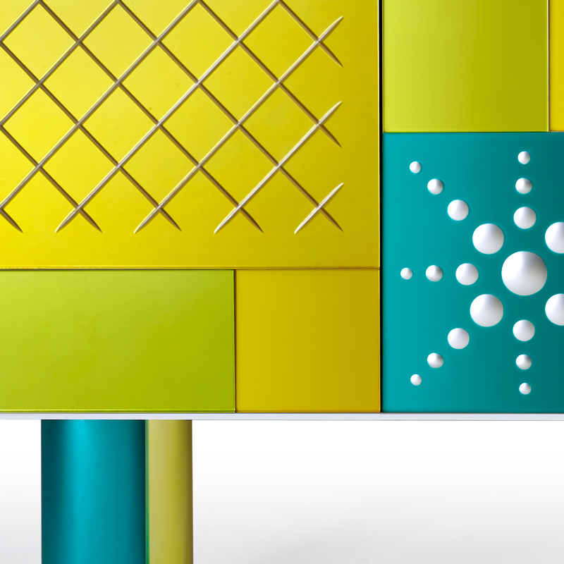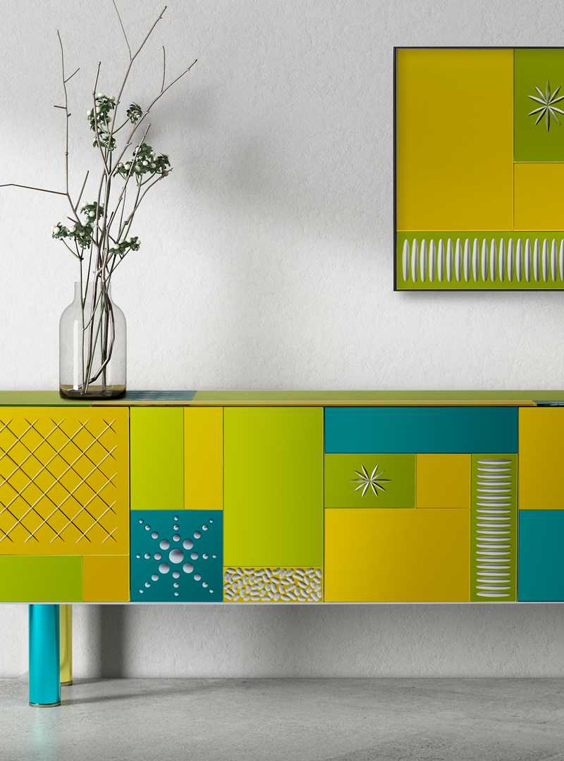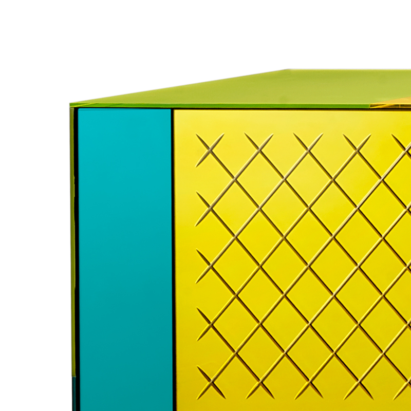 Четыре фасада и четыре ящика с системой push-pull (без ручек). Структура из многослойного дерева. Панели из матированного стекла 6 мм, покрашенные в разные цвета и украшенные ручной гравировкой. Ножки: цветное боросиликатное стекло с серебрением. Возможны незначительные отличия цвета из-за нанесения лака вручную.
