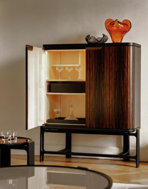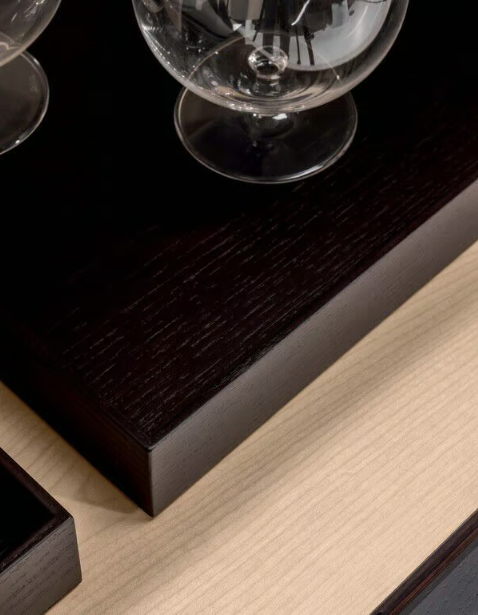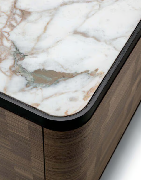 Каркас из массива ясеня, шпон или инкрустация American walnut, шпон эбенового дерева. Столешница в шпоне ясеня, из тонированного стекла или мрамора. Дополнительно выдвижные ящики в коже, подсветка.