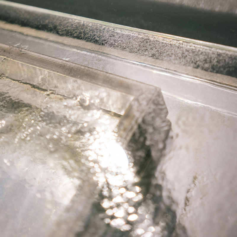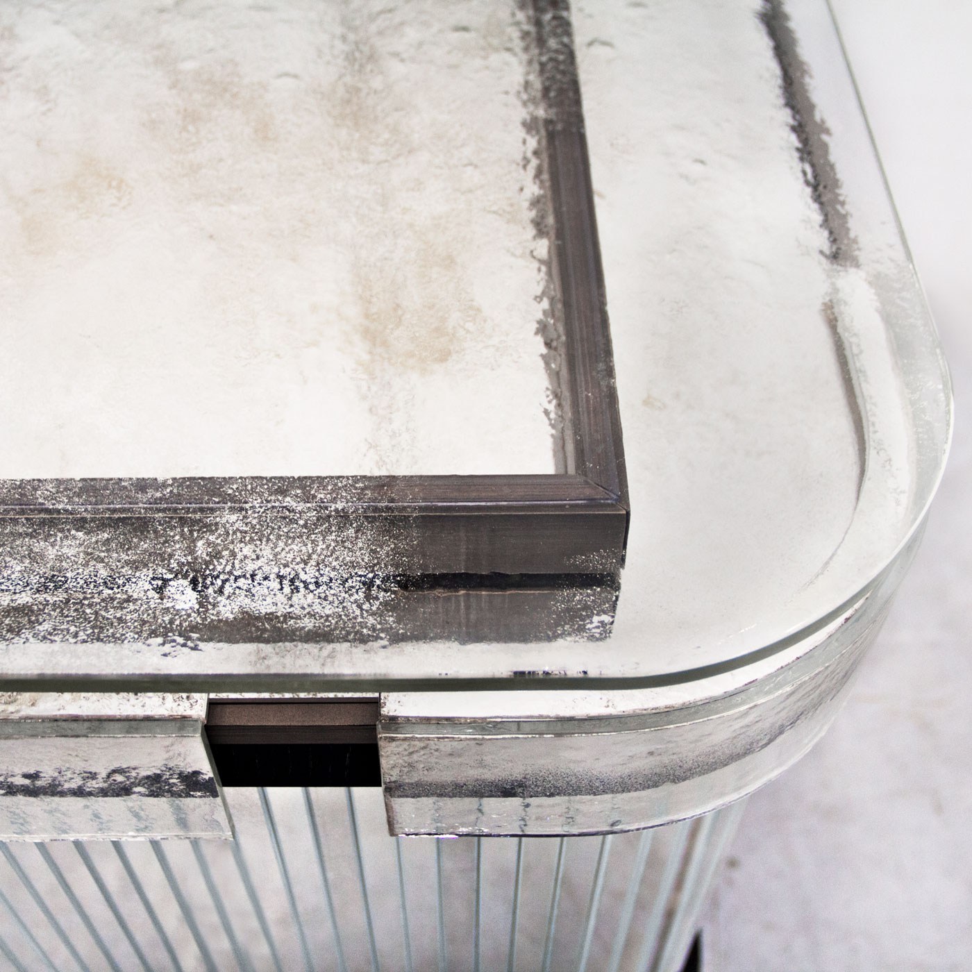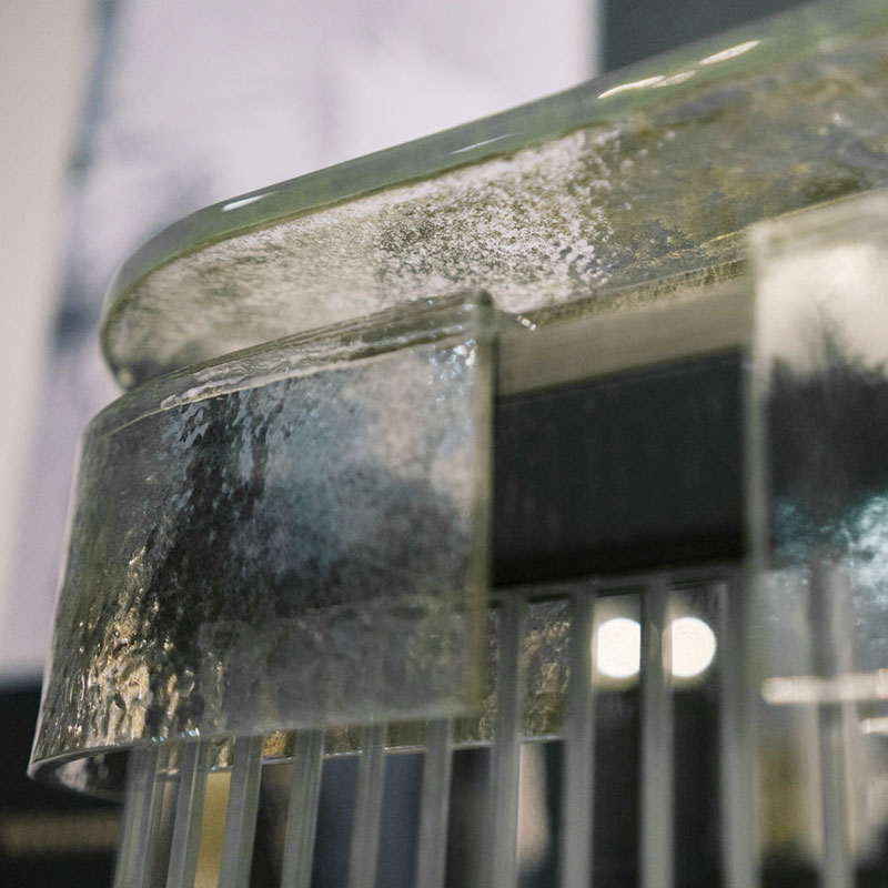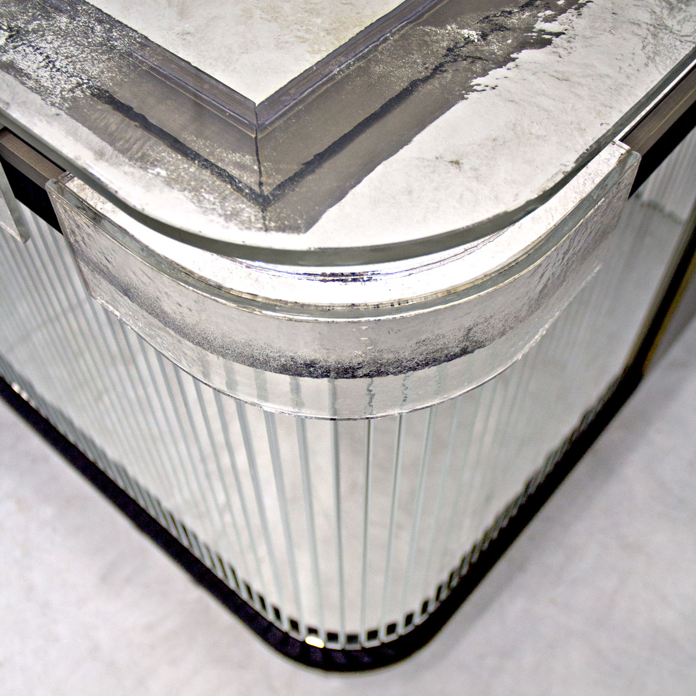 Фигурная столешница из стекла с частично зеркальной поверхностью.