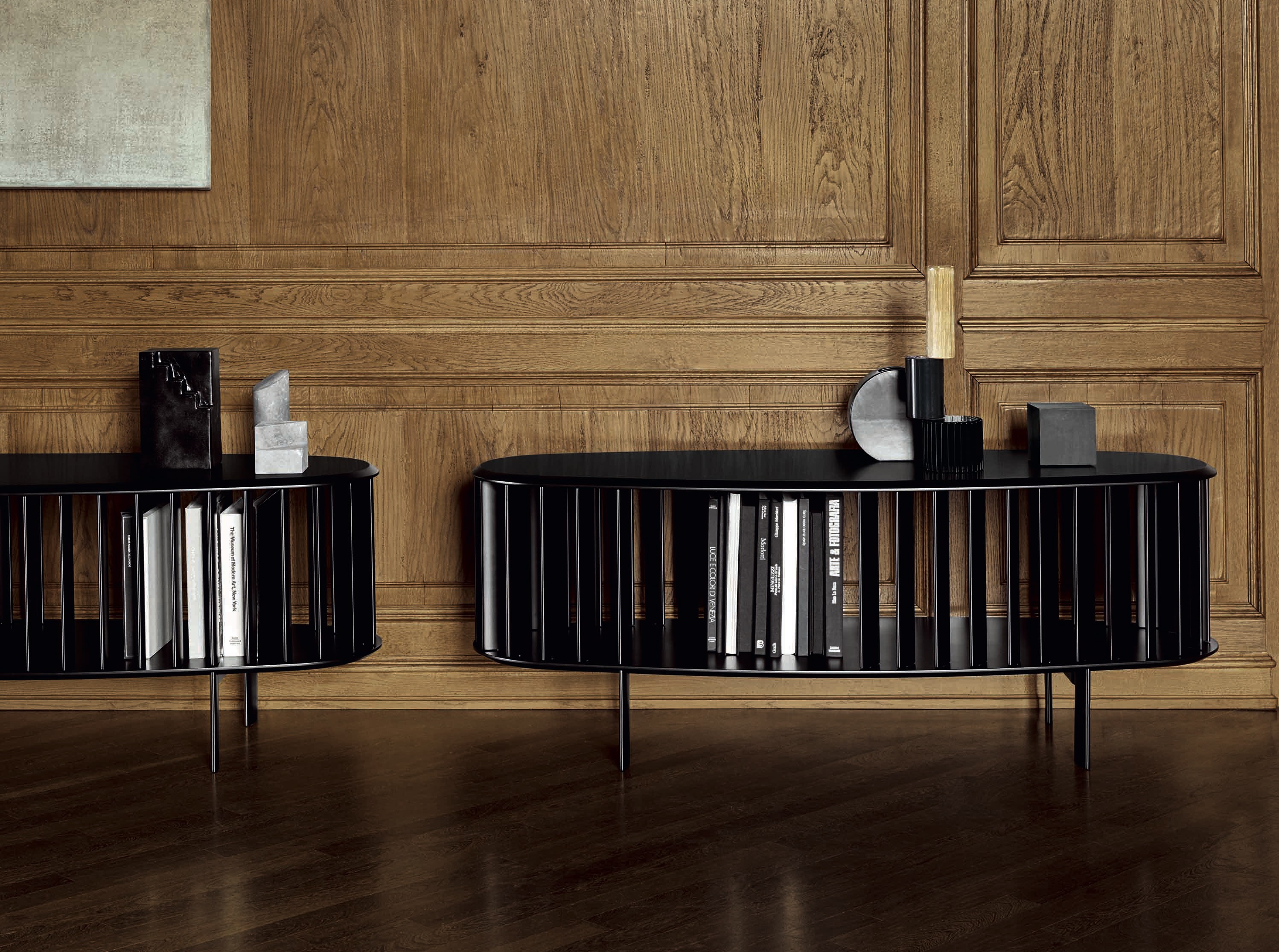 Islands — это коллекция отдельно стоящих комодов доступ к которым возможен с разных сторон благодаря обрамлению из деревянных планок, кажущихся расположенными хаотично. Однако благодаря центральной оси они могут вращаться вокруг своей оси, превращая изделие то в цельный объём, то в лёгкую, воздушную конструкцию. Многогранное прочтение одного и того же предмета, в котором всегда ощущается тонкая ремесленная работа.