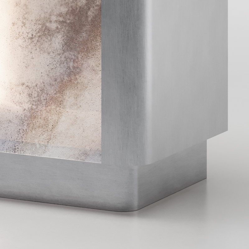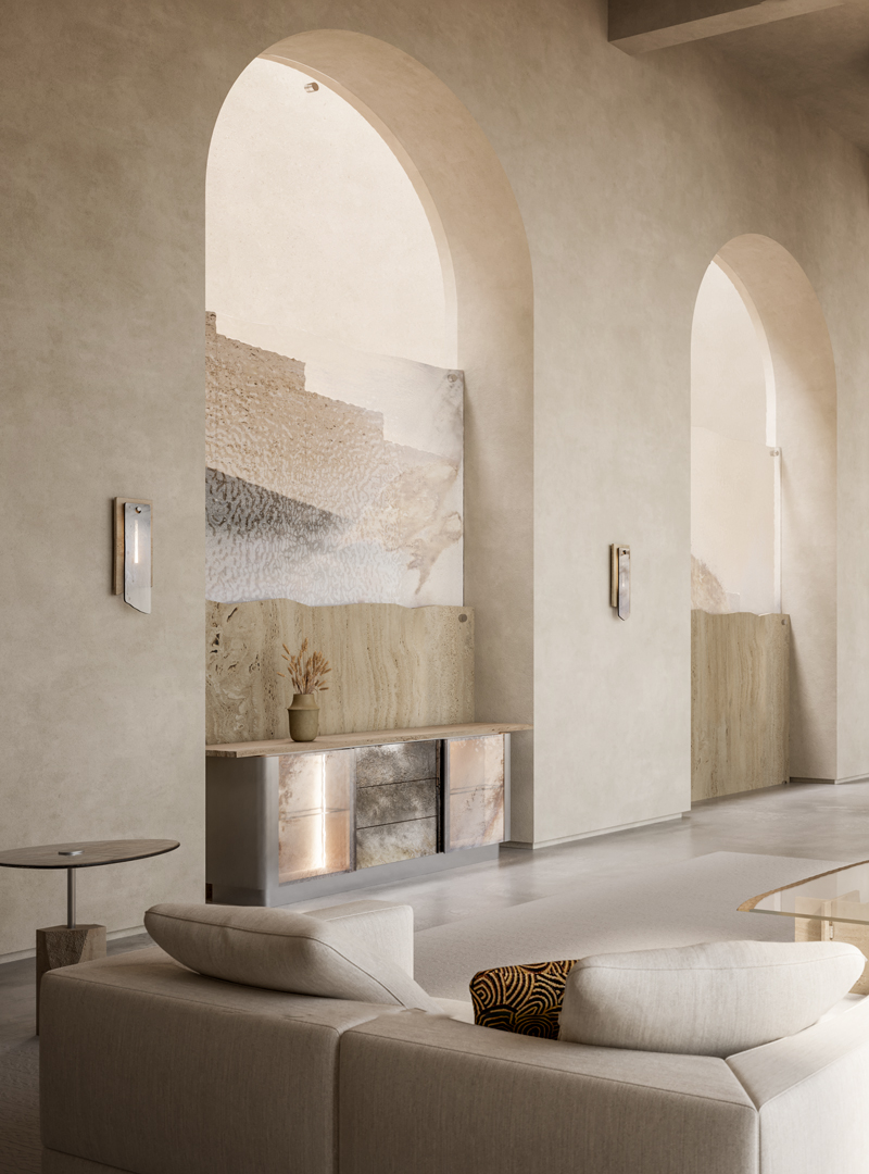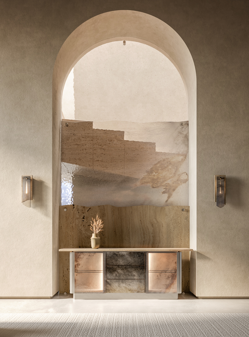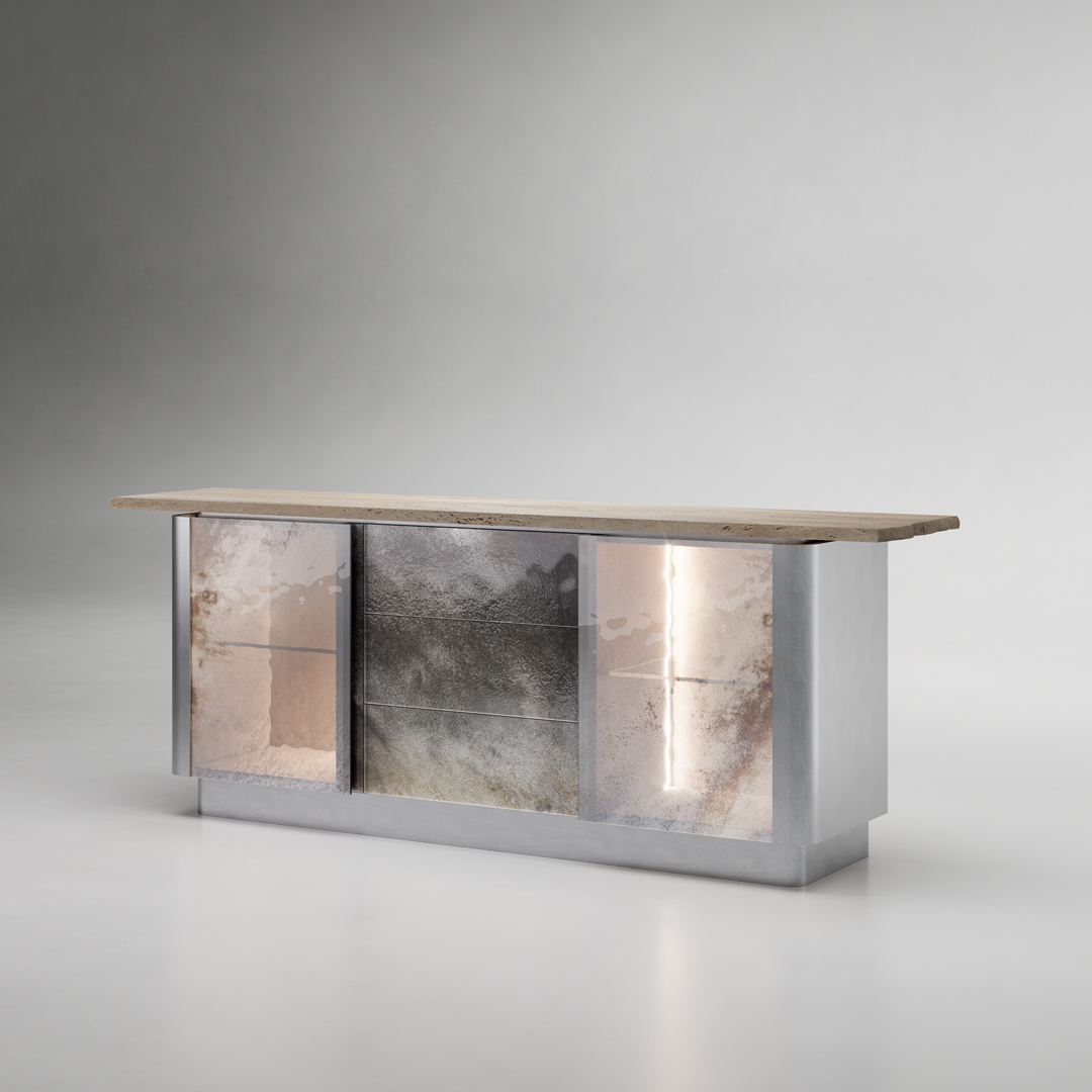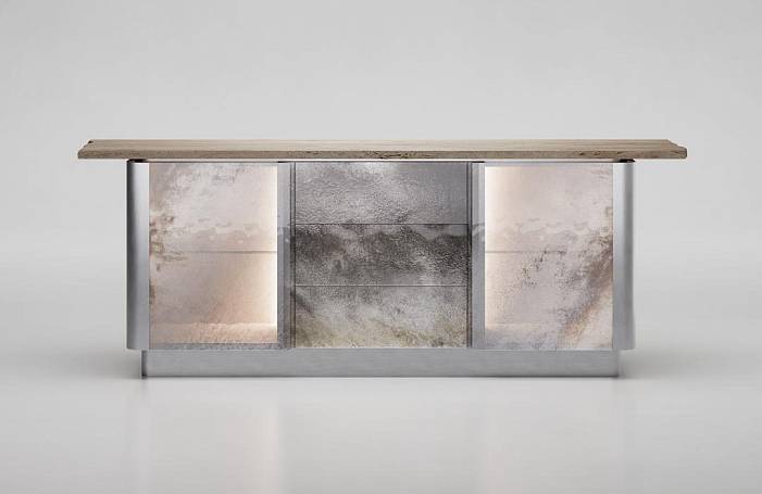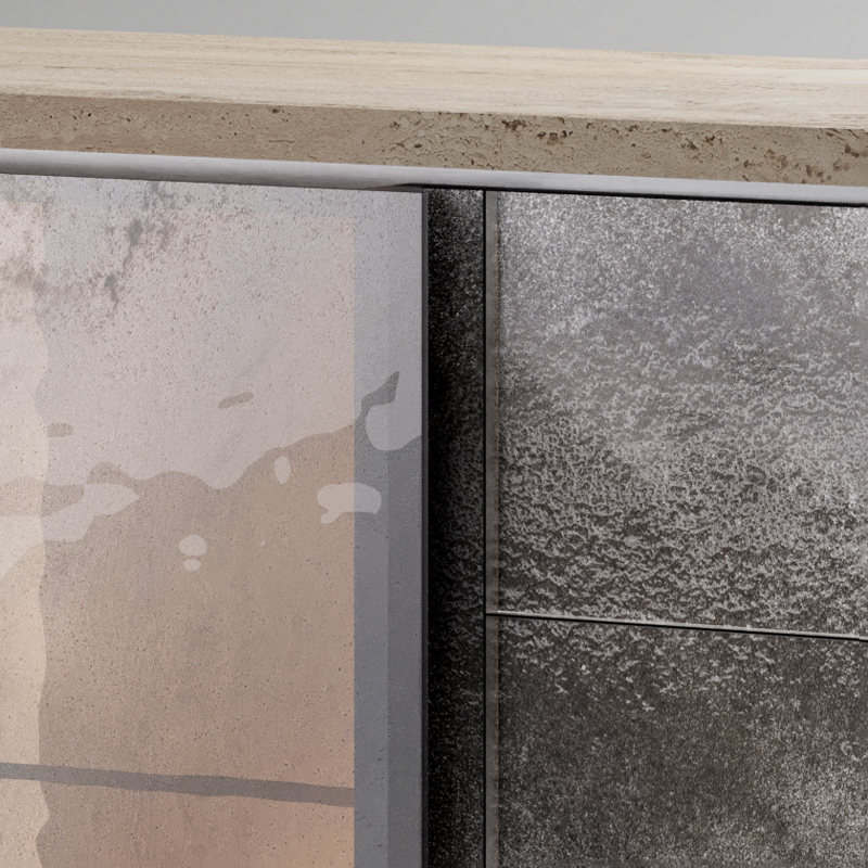 Фасады и ящики выполнены из прозрачного закаленного стекла с многослойным декором Ref. Fondale. Структура из стали с матовой сатинированной поверхностью дополнена столешницей из натурального мрамора травертина. Внутреннее пространство отделано шпоном ясеня в отделке "beige linen". Оснащение: полки из прозрачного стекла и встроенная светодиодная подсветка.