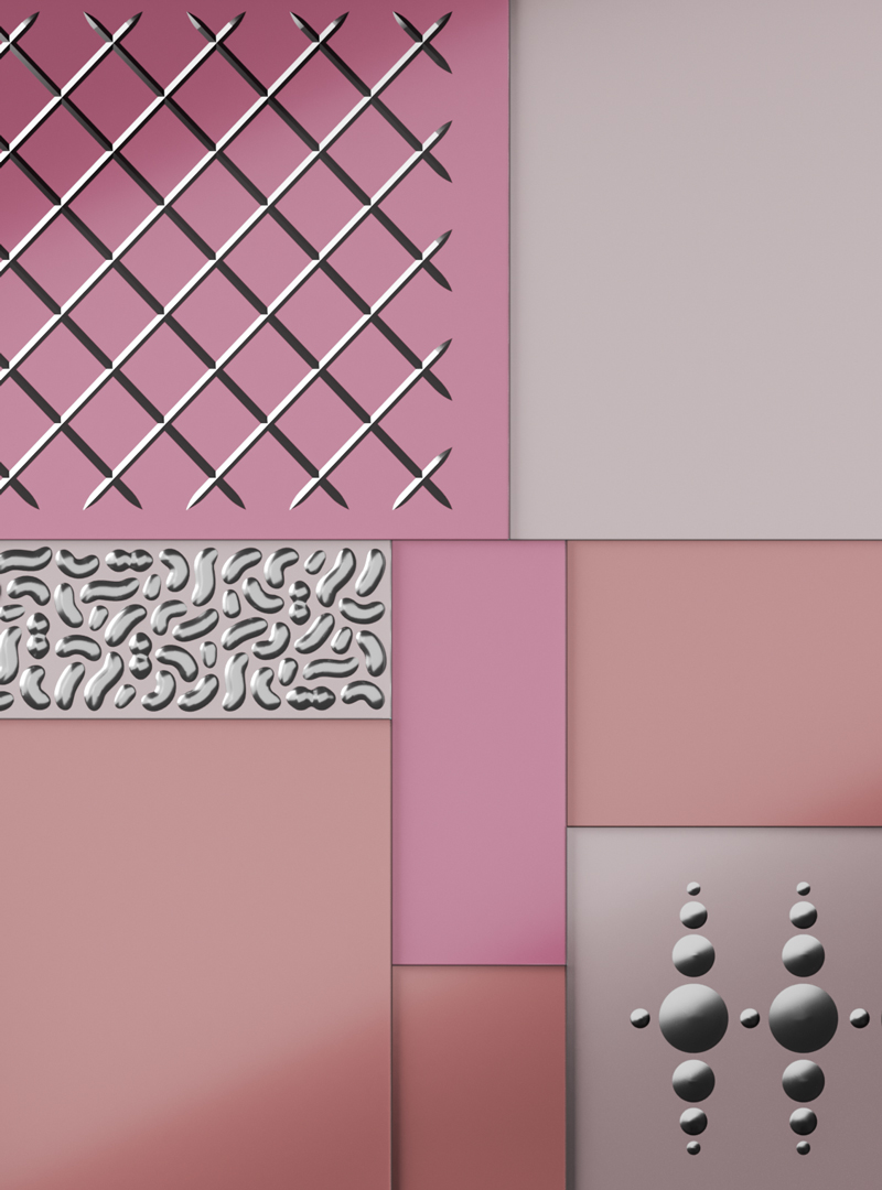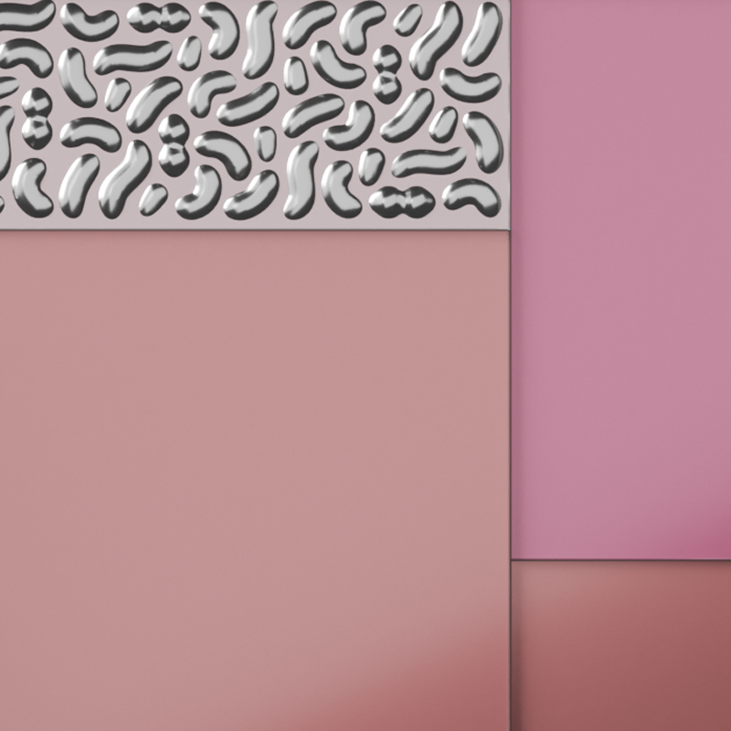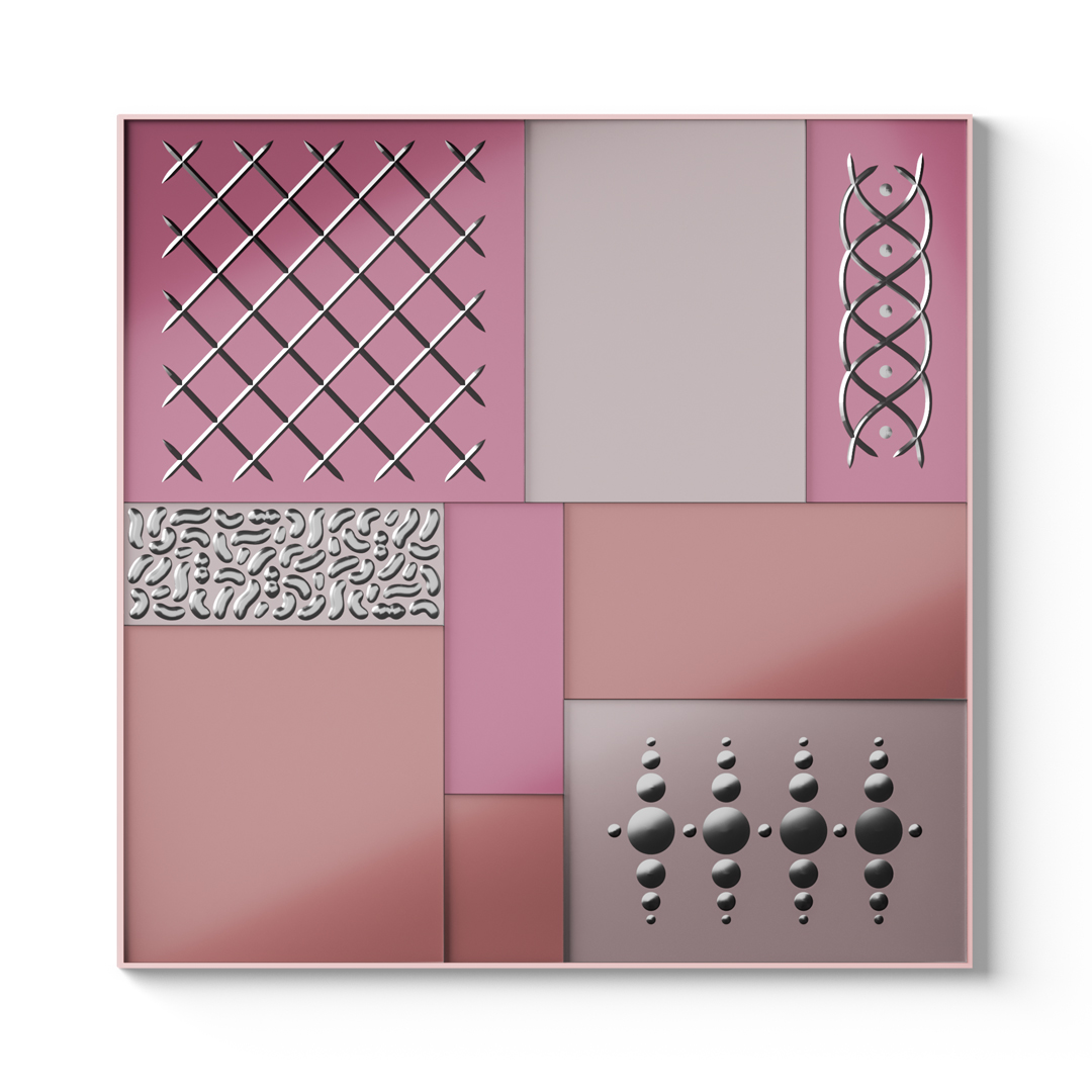 Рама из дерева, крашенная глянцевым лаком оттенка «antique rose». Сверху - разноразмерные панели из сверх-прозрачного стекла толщиной 6 мм, крашенные в разные оттенки розового. По поверхности нанесена серебряная гравировка, выполненная вручную, что делает каждый экземпляр уникальным.