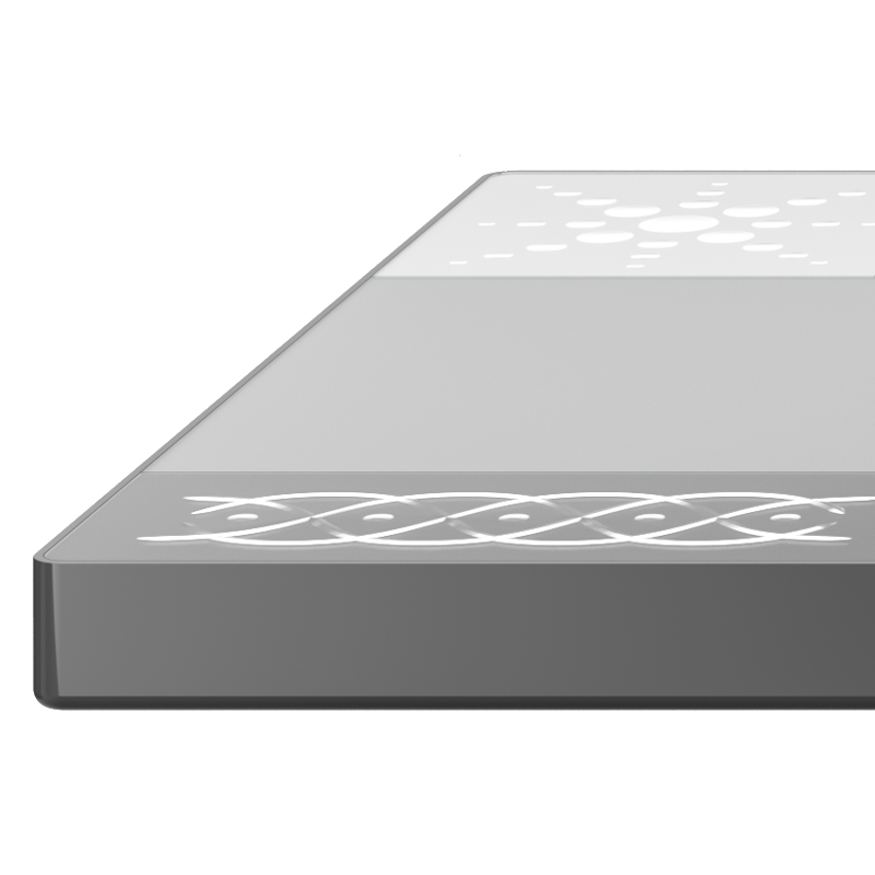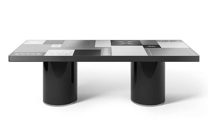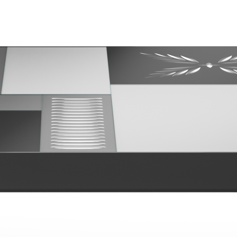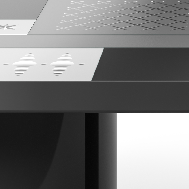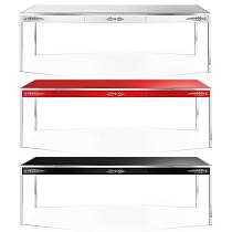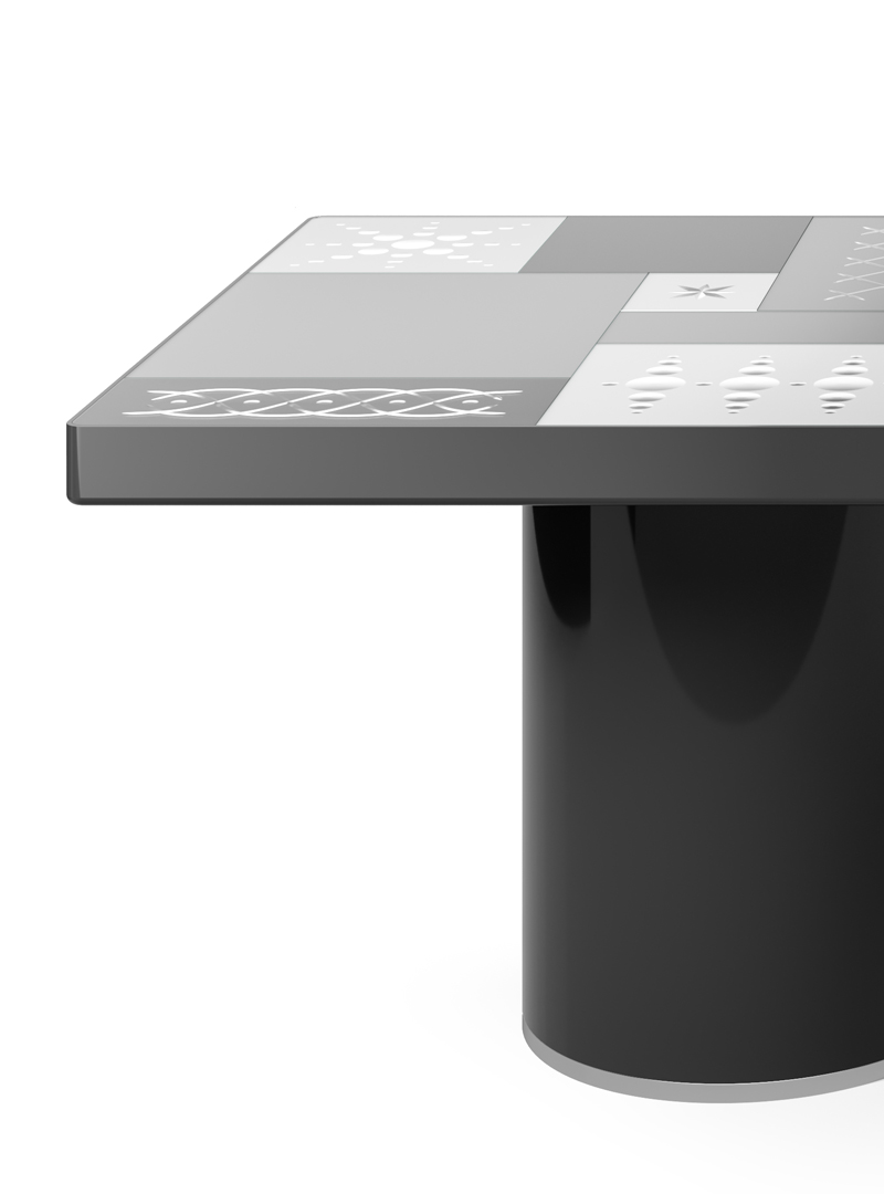 Столешница: прозрачное стекло толщиной 6 мм с кислотным матированием, покрытое лаком разных оттенков и украшенное ручной гравировкой серебром.