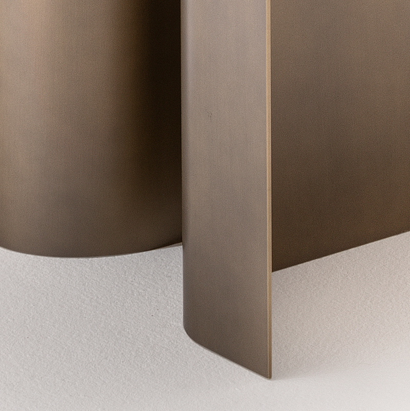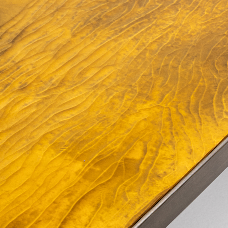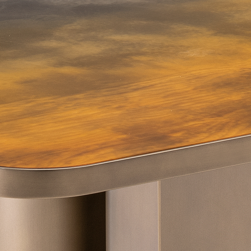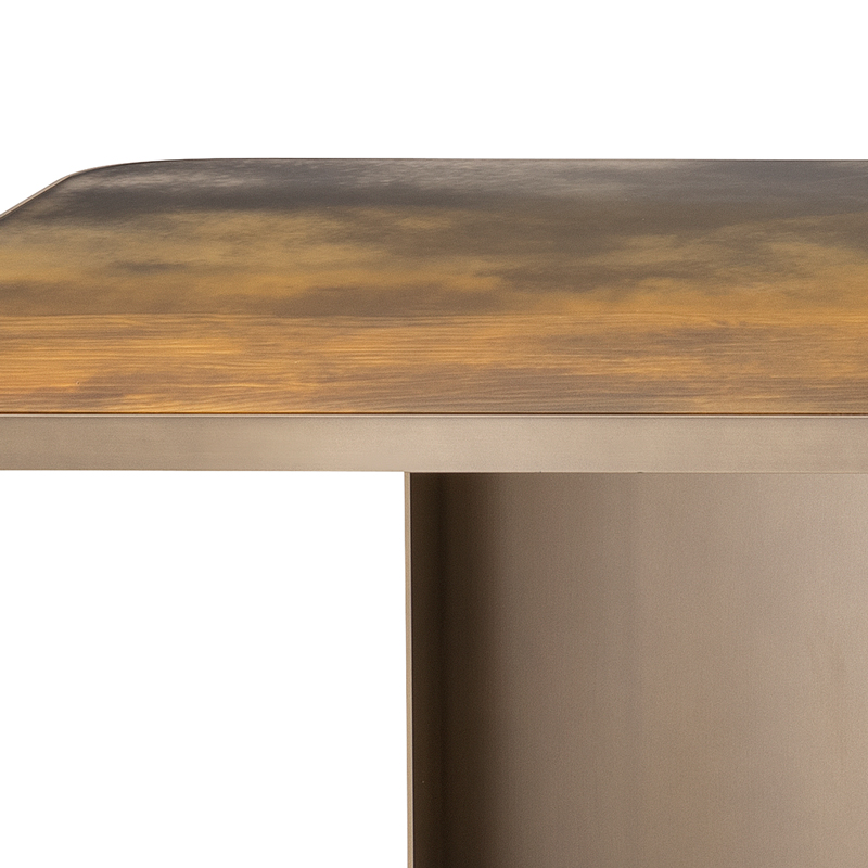 Столешница выполнена из матированного стекла с декором Gargano. Край столешницы отделан деревом с лакировкой под состаренную латунь, а ножки полностью изготовлены из состаренной латуни, что придает изделию благородный, сдержанный блеск.