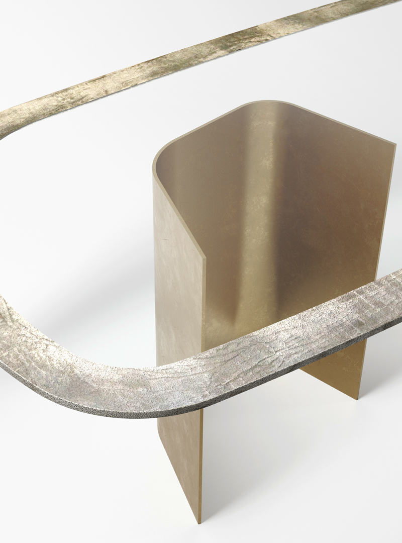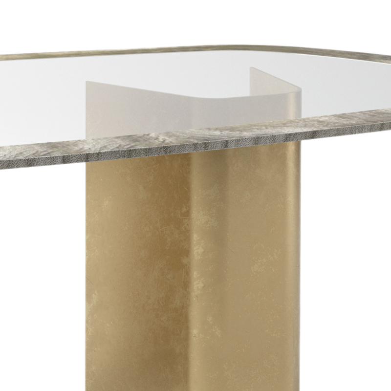Металлическое основание с отделкой «состаренная латунь» поддерживает столешницу из прозрачного стекла толщиной 15 мм. Особую выразительность придает обработка кромки столешницы — гравировка алмазным и серебряным кругом, подчеркивающая чистоту линий.