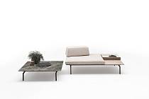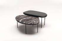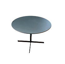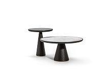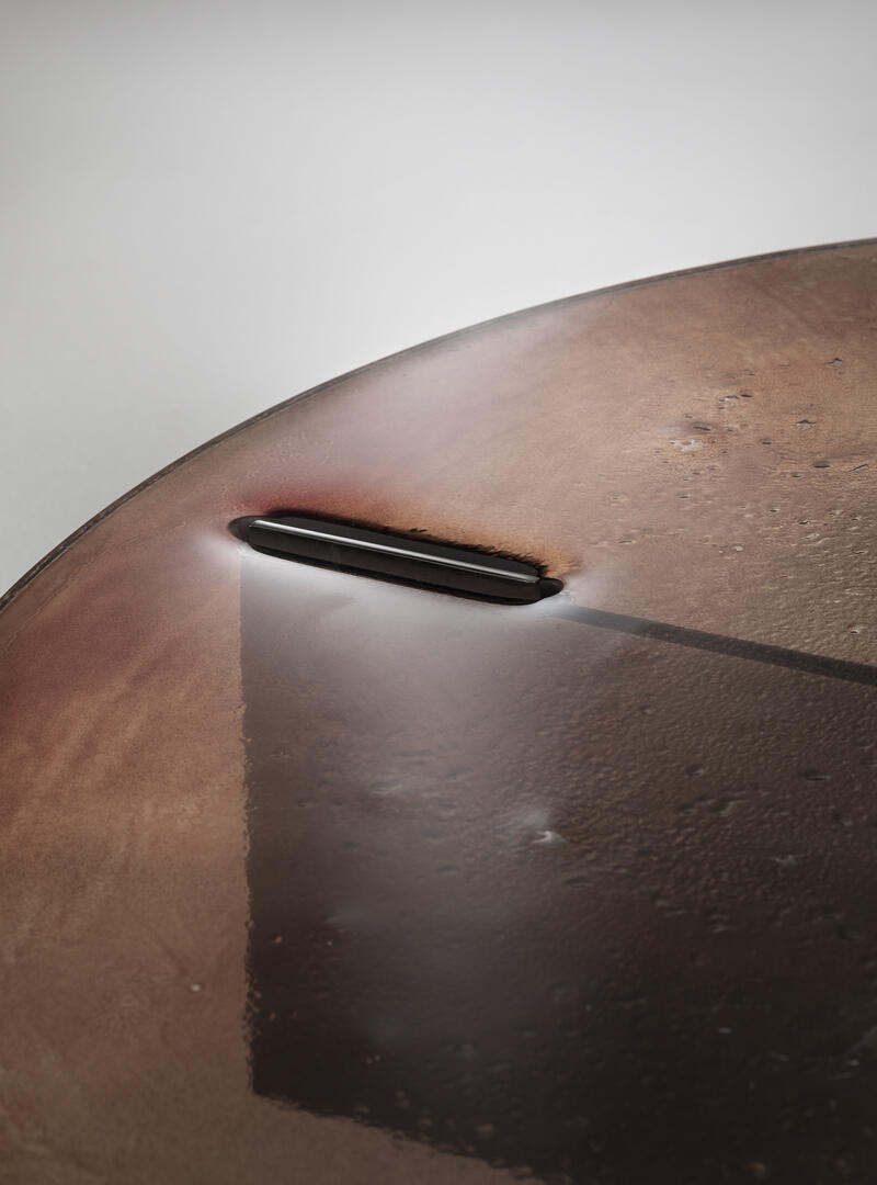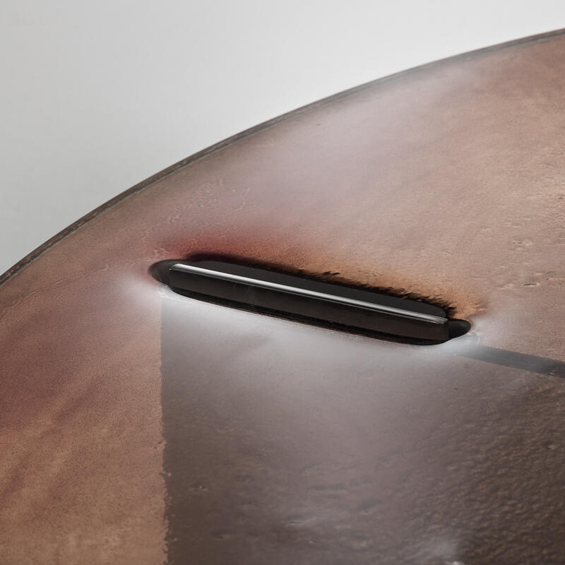 Столешница с неровными краями выполнена по уникальной технологии из двух слоев стекла, запеченных вместе, что создаёт выразительную фактуру. Ее поверхность покрыта лаком, переходящим от насыщенного бронзового тона в прозрачный, с частичным серебрением сзади.Основание из листового железа с отделкой полированный никель.