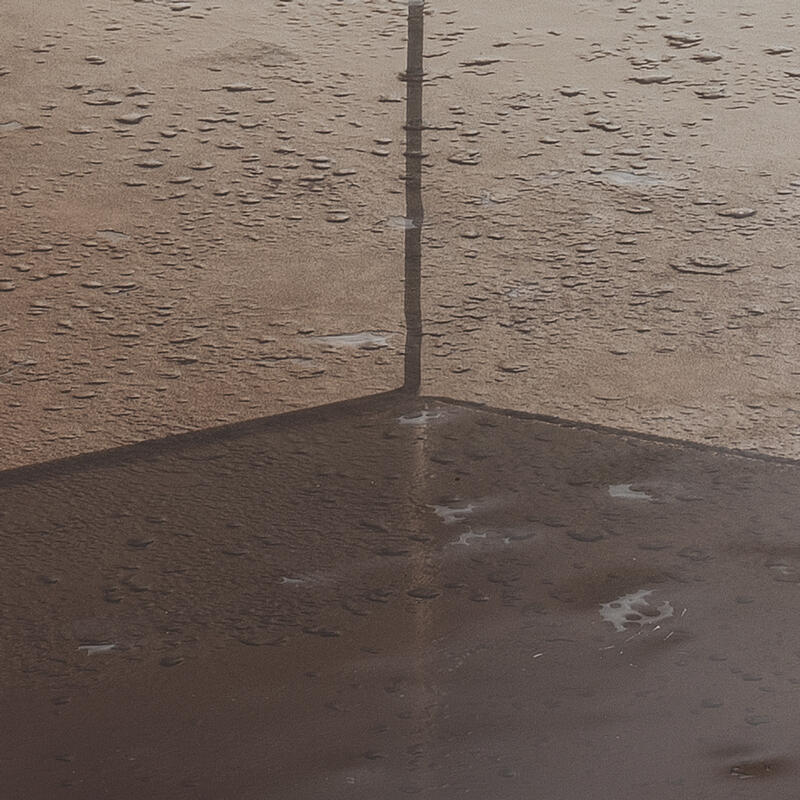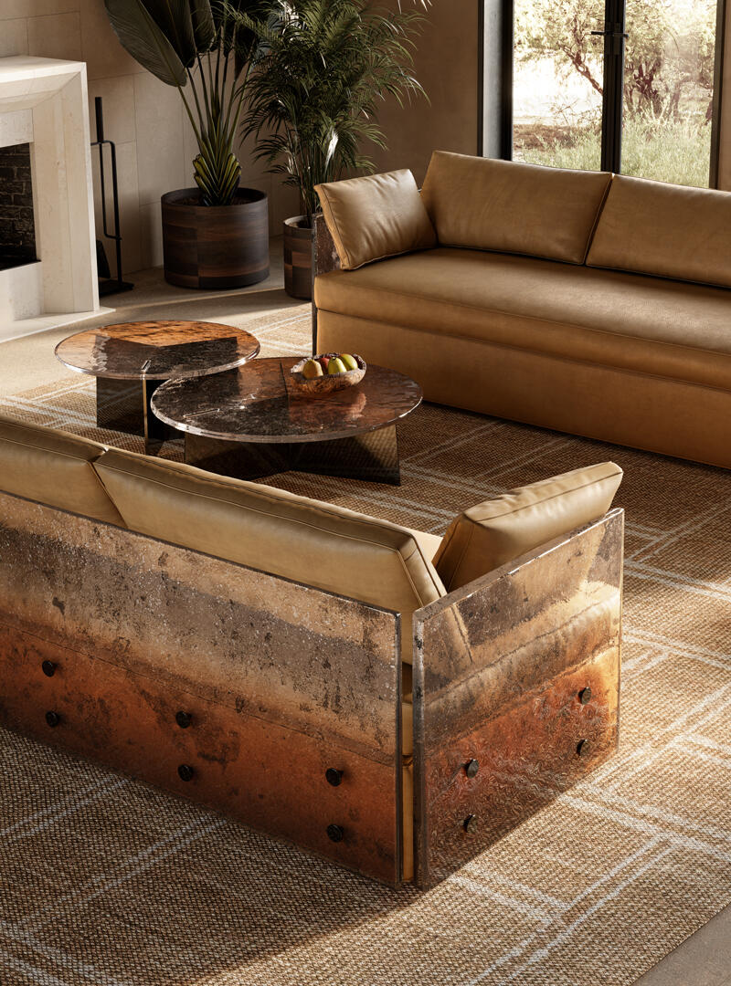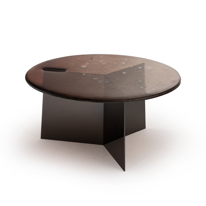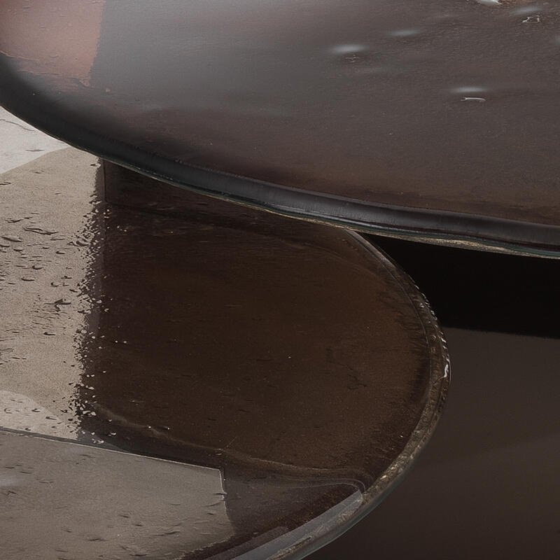 Столешница с неровными краями выполнена по уникальной технологии из двух слоев стекла, запеченных вместе, что создаёт выразительную фактуру. Ее поверхность покрыта лаком, переходящим от насыщенного бронзового тона в прозрачный, с частичным серебрением сзади.Основание из листового железа с отделкой полированный никель.